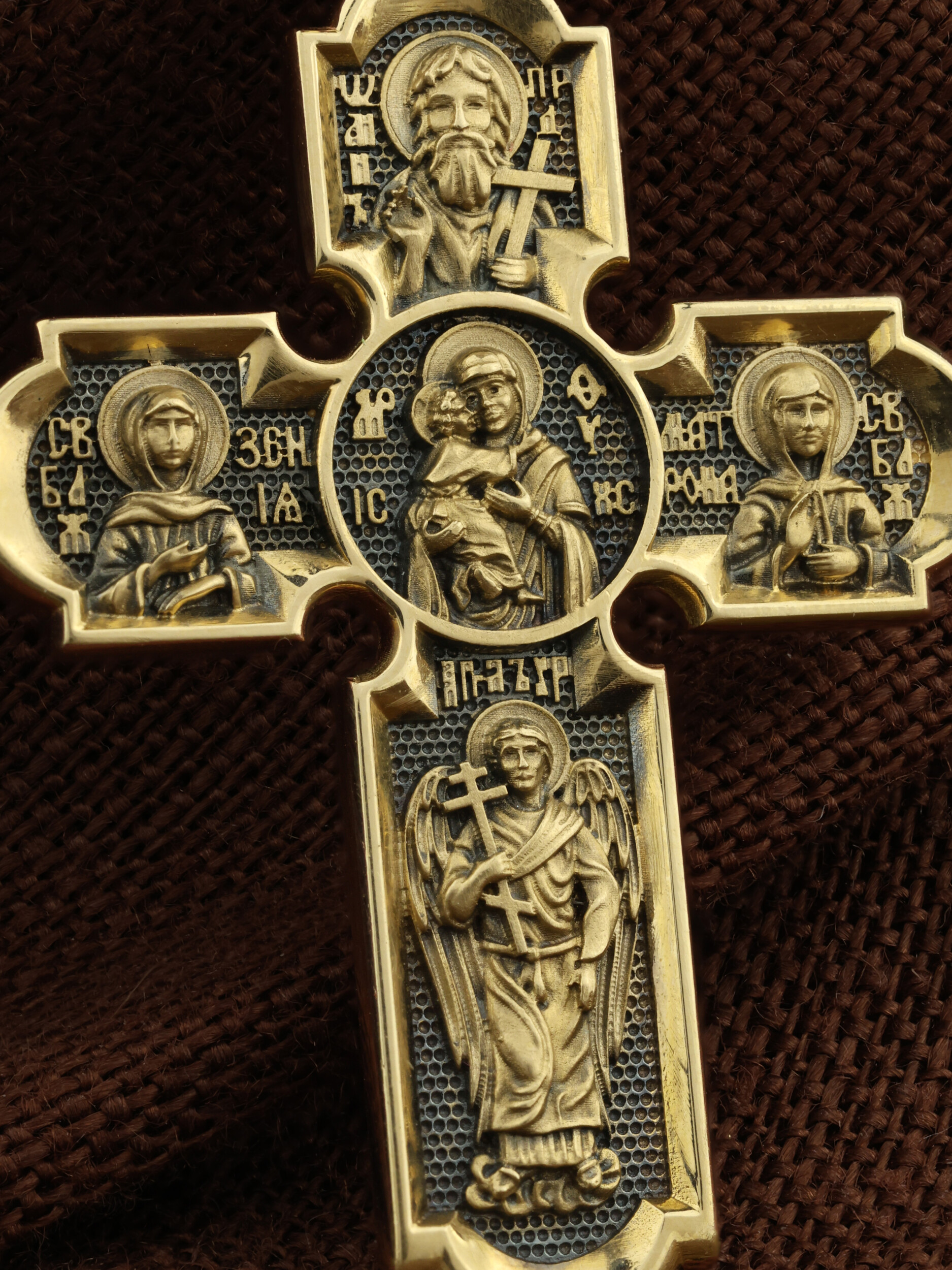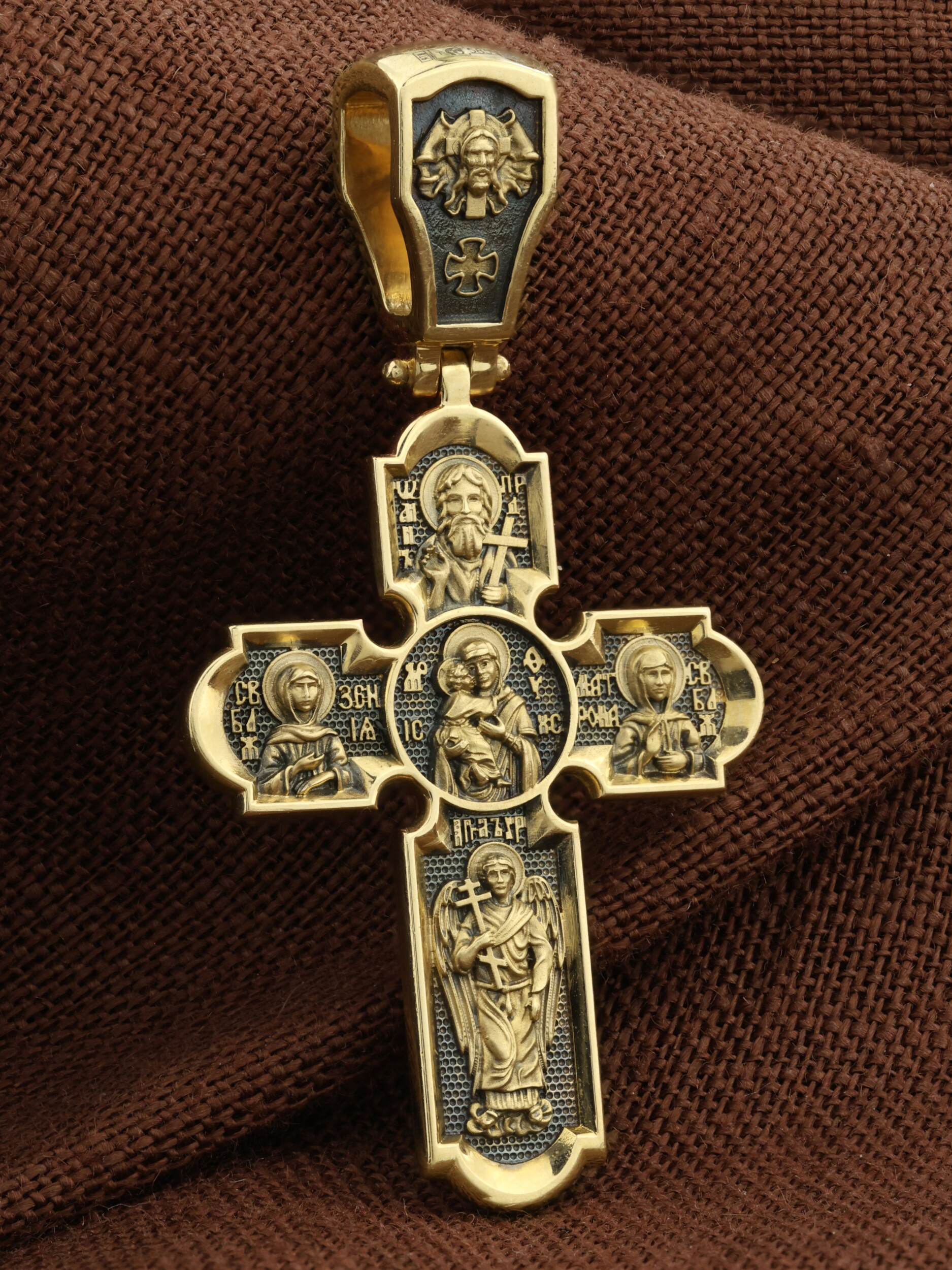 Центральную часть оборота креста украшает Владимирская икона Божией Матери. По преданию, она была написана на доске трапезного стола из дома Иисуса Христа. На Русь икона была привезена в начале XII века и с тех пор почитается как главная святыня нашего Отечества. Внизу изображен Архангел Михаил, слева — Святая Блаженная Ксения, справа — Святая Блаженная Матрона, вверху — пророк, почитающийся в христианстве, Предтеча Господень Иоанн Креститель. На кулонном кольце изображен Спас Нерукотворный — Символ вочеловечившегося Божества.