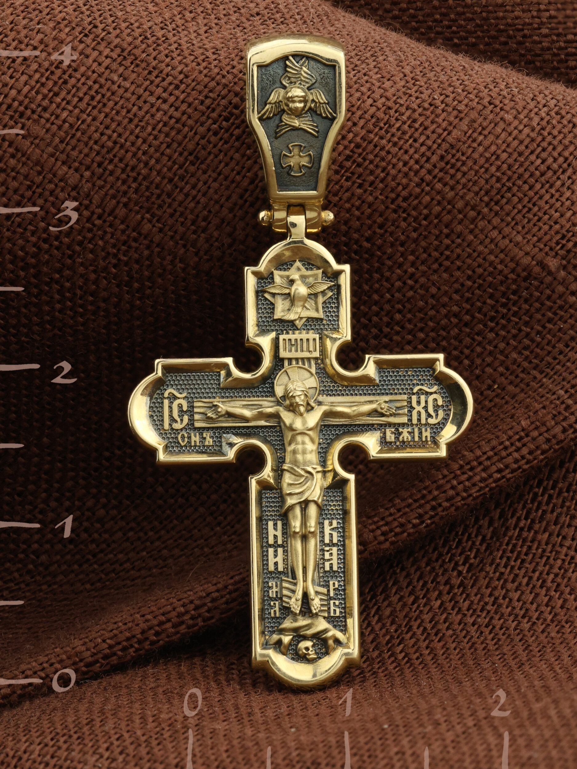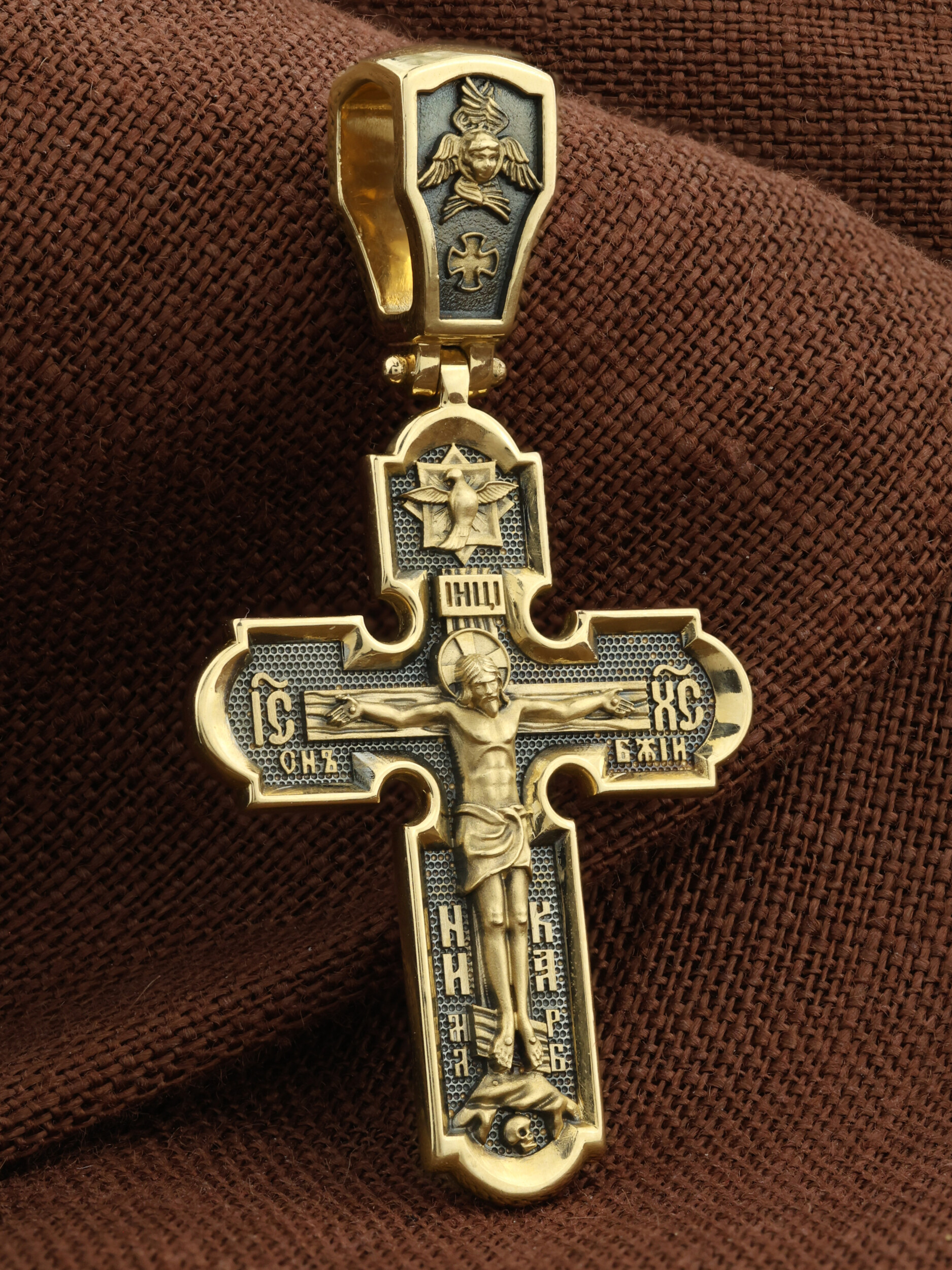 На лицевой стороне креста изображено Распятие Иисуса Христа. Господь представлен свободно покоящимся на кресте с простертыми руками и как бы обнимающим всю Вселенную. Верхняя перекладина символизирует титло — табличку, на которой, согласно Евангелию, было начертано: Иисус Назорей Царь Иудейский (IНЦI). Также Распятие сопровождается надписями, олицетворяющими Христа: святое имя Христа «IC» (Иисус) «ХС» (Христос), и словосочетание «СНЪ БЖIЙ» — СЫН БОЖИЙ. Рядом с образом Христа помещены слова — «НИКА» (греч. — Победитель) и четыре буквы «МЛ» «РБ» — Место Лобное Рай Бысть. Возвышение, на котором стоит Крест, символизирует гору Голгофу, на которой произошло Распятие. У подножия Креста изображают прах Адама, обозначенный черепом. На кулонном кольце изображен шестикрылый Серафим — самый приближенный к Господу Ангел.