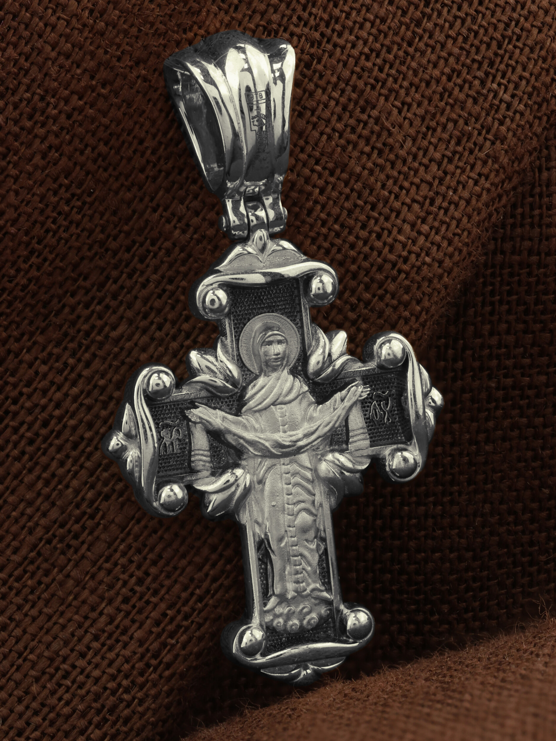 На оборотной стороне креста изображена икона Божией Матери «Покров Пресвятой Богородицы». Праздник Покрова Пресвятой Богородицы пришел на Русь в XII веке из Византии и стал одним из самых почитаемых. В 910 году Византийской Империи угрожали нападением сарацины. Не видя ниоткуда помощи, в те дни греки во множестве стекались в Константинополь, во Влахернский храм, в котором хранились риза Богоматери и Ее головной покров, и молились. 1 (14) октября 910 года Святому Андрею Юродивому и его ученику Епифанию было видение Покрова Божией Матери. Пресвятая Богородица, в окружении Святых, явилась над алтарем Храма и слезно молилась. По окончании молитвы сняла с Себя блистающее великое и страшное покрывало, которое носила на Пречистой главе Своей и, держа его с великой торжественностью, распростерла над всем стоящим народом. Вскоре враги без всякого кровопролития отступили от города. Богородица простирает Свой молитвенный покров над всеми православными христианами и умоляет Сына своего о даровании вечного спасения каждому человеку.