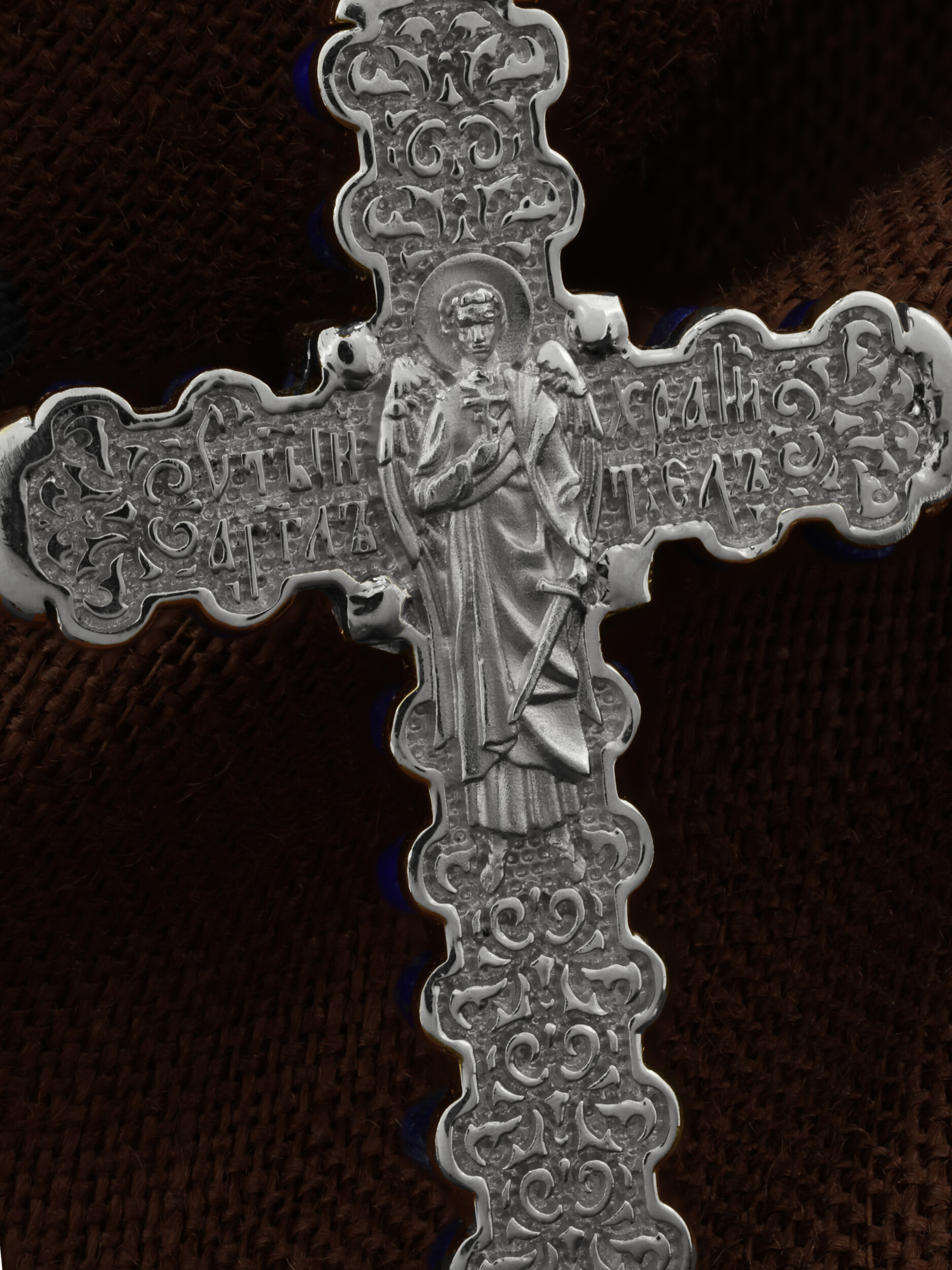 На оборотной стороне креста изображен святой Ангел-Хранитель в виде прекрасного юноши держащего в правой руке крест, а в левой — сферу. Ангел-Хранитель — это Ангел приставляемый Богом к человеку при крещении для охраны и помощи в добрых делах. Невидимо пребывая при нас постоянно, он, руководствуя нас ко спасению, не только по нашему желанию таинственно наставляет нас на все доброе и полезное, не только возносит наши молитвы к Богу, но еще и сам от себя охраняют и защищают нас от врагов видимых и невидимых, ходатайствует за нас пред Богом.