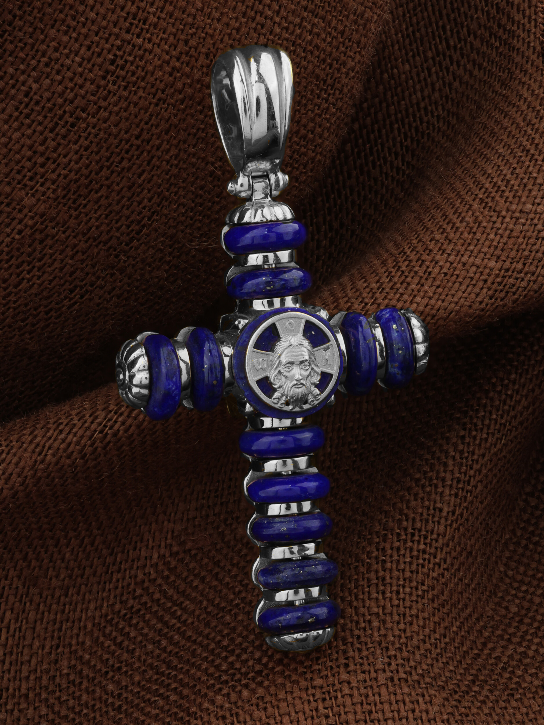 В центральной части лицевой стороны креста изображен Спас Нерукотворный — образ Господа и Спасителя нашего Иисуса Христа, чудесно отпечатавшийся на плате, котором Христос вытер свой лик. Согласно Преданию, изложенному в Четьи Минее, Авгарь V Ухама, больной проказой, послал ко Христу своего архивария Ханнана (Ананию) с письмо, в котором просил Христа прийти в Едессу и исцелить его. Ханнан же был художником, и Авгарь поручил ему, если Спаситель не сможет прийти, то написать хотя бы Его образ и принести ему. Видя, что Ханнан хочет сделать Его портрет, Христос потребовал воды, умылся, вытер Свой лик платом, и на этом плате отпечатался Его образ. Спаситель передал этот плат Ханнану с повелением отнести с ответным письмом пославшему его. Получив портрет, Авгарь исцелился от главного своего недуга, но лицо его оставалось еще поврежденным. После Пятидесятницы в Едессу пошёл святой апостол Фаддей, один из 70-ти, закончил исцеление Авгаря и обратил его в христианство. Авгарь прикрепил образ к доске и поместил в нише над городскими воротами, убрав оттуда находившегося там идола.