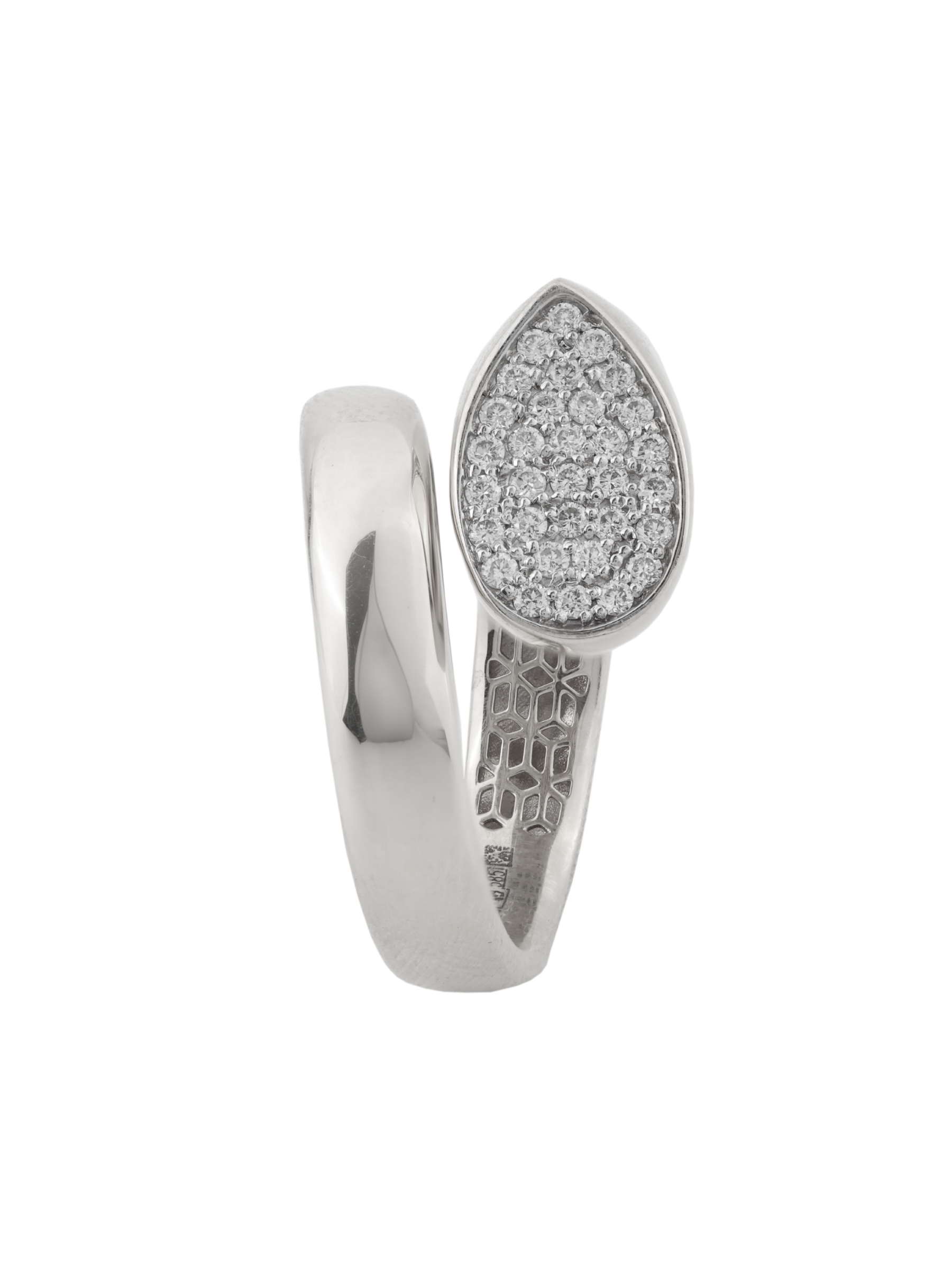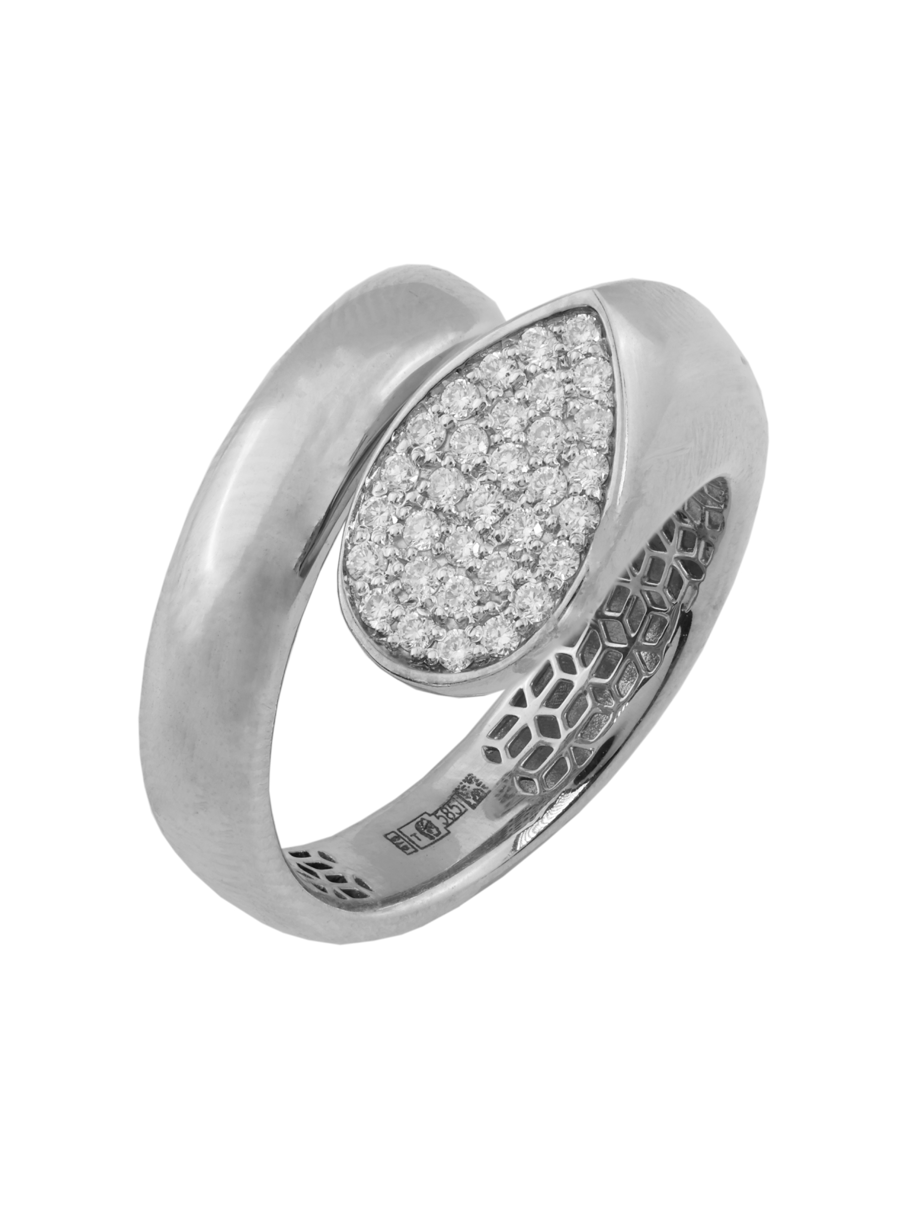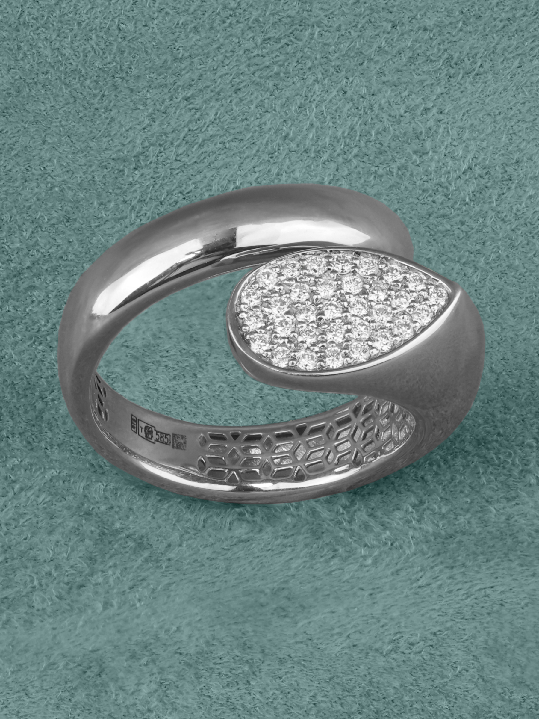Изысканное кольцо из белого золота 585 пробы станет утонченным акцентом вашего образа. Дизайн, вдохновленный итальянским стилем, подчеркивает статус и безупречный вкус владельца. Ювелирное изделие привлекает внимание своей необычной формой: лаконичная шинка плавно переходит в декоративный элемент, инкрустированный россыпью сияющих камней. Это украшение органично смотрится как на женской, так и на мужской руке, становясь универсальным дополнением любого стиля.
