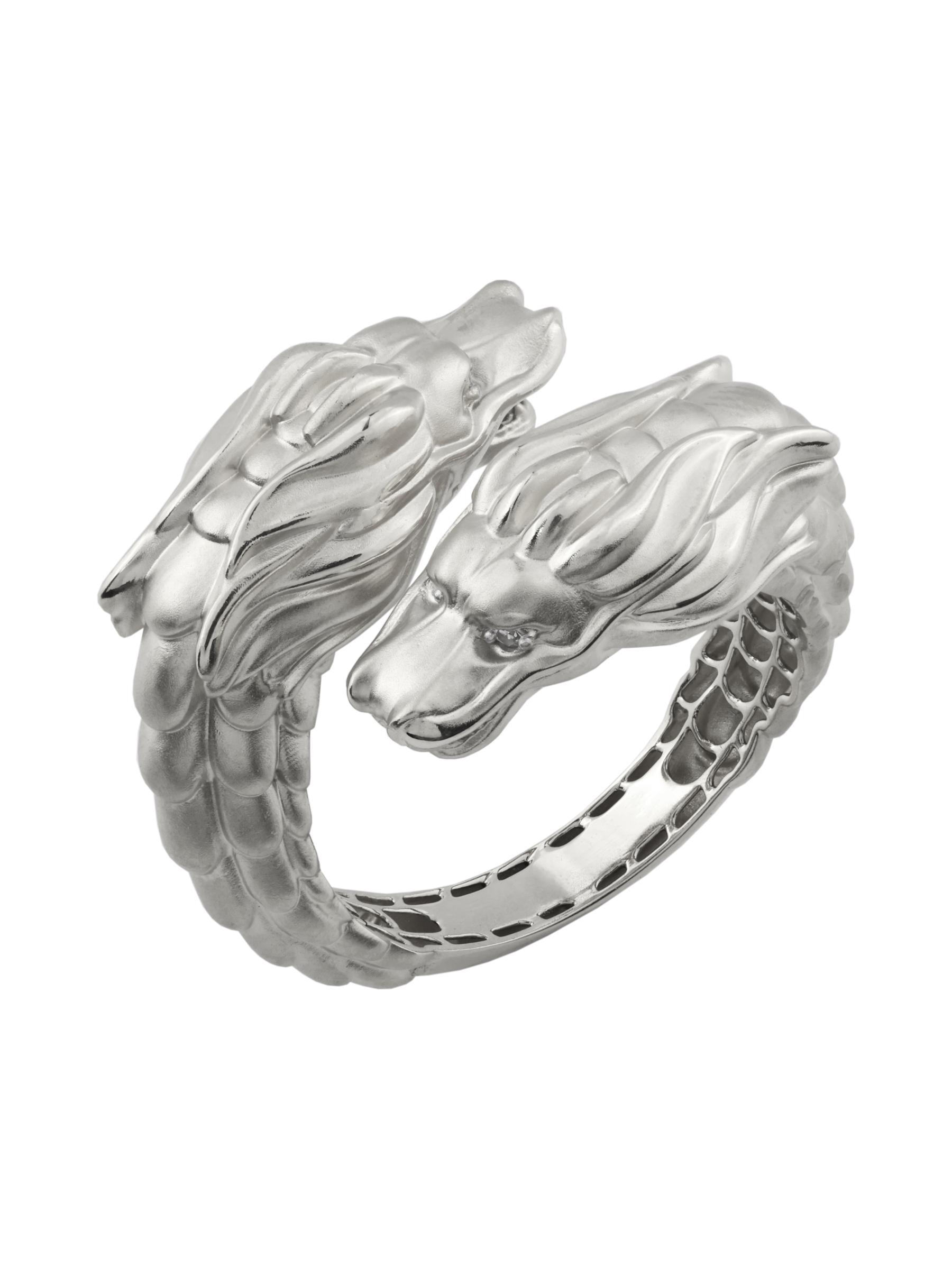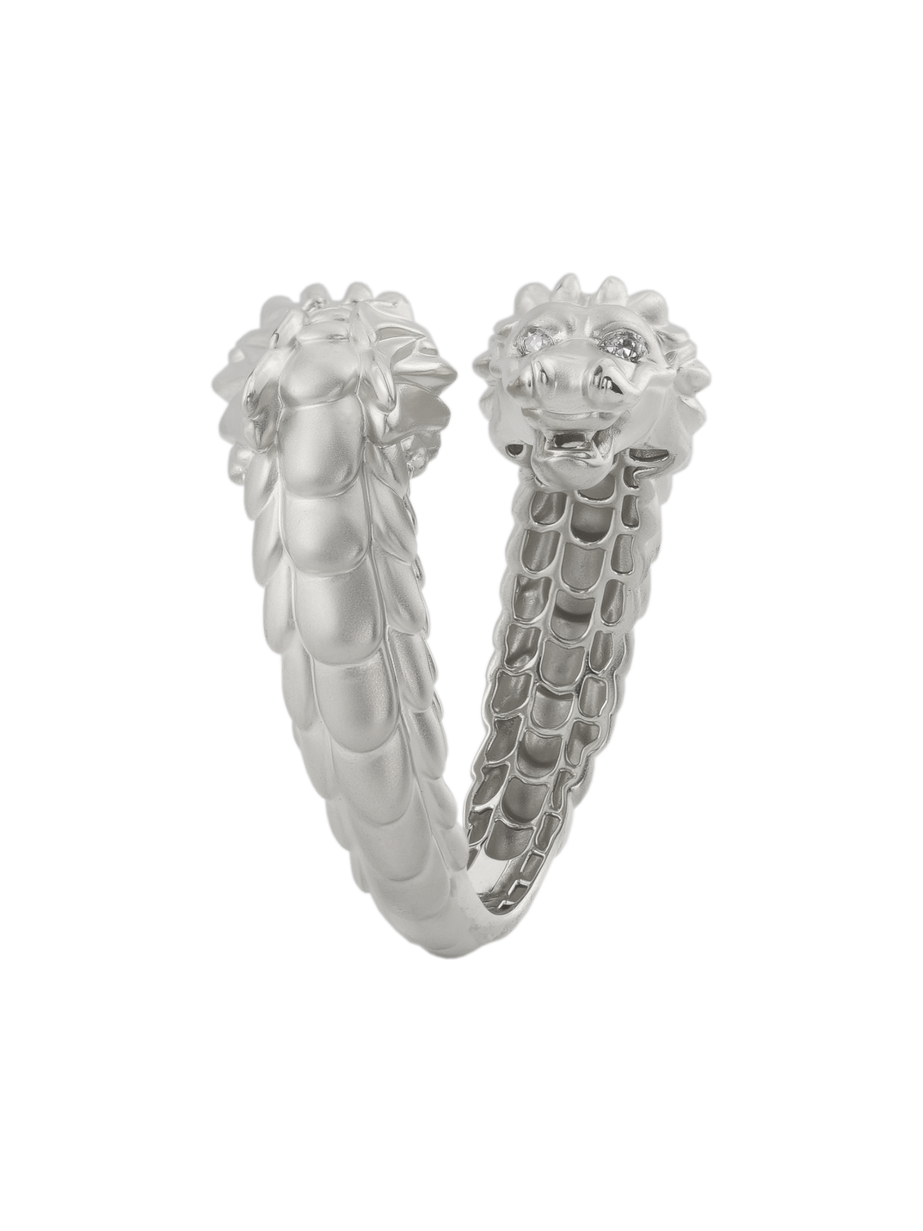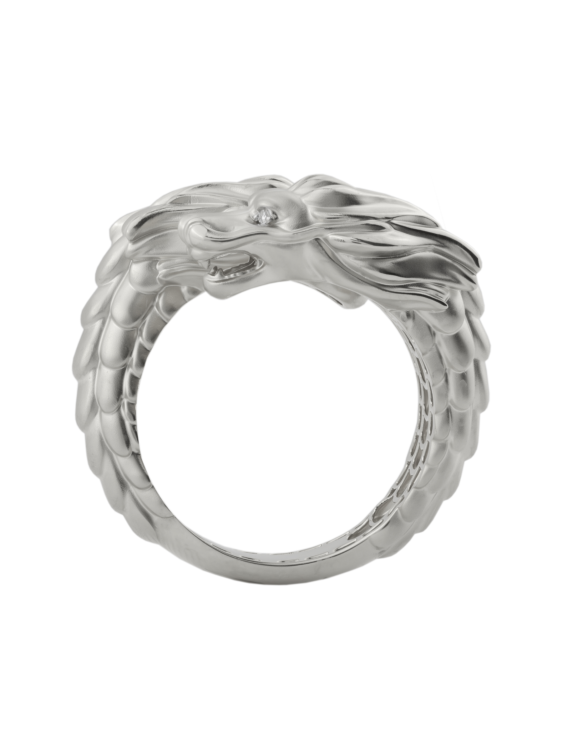 Композиция дополнена вставками: 4 бриллианта круглой формы с чистым белым цветом красиво отражают свет, создавая благородное сияние. Матовое белое золото придает кольцу сдержанный, но притягательный вид, подчеркивая безупречность линий дракона. Это украшение создано для тех, кто ценит индивидуальность и предпочитает аксессуары с характером.