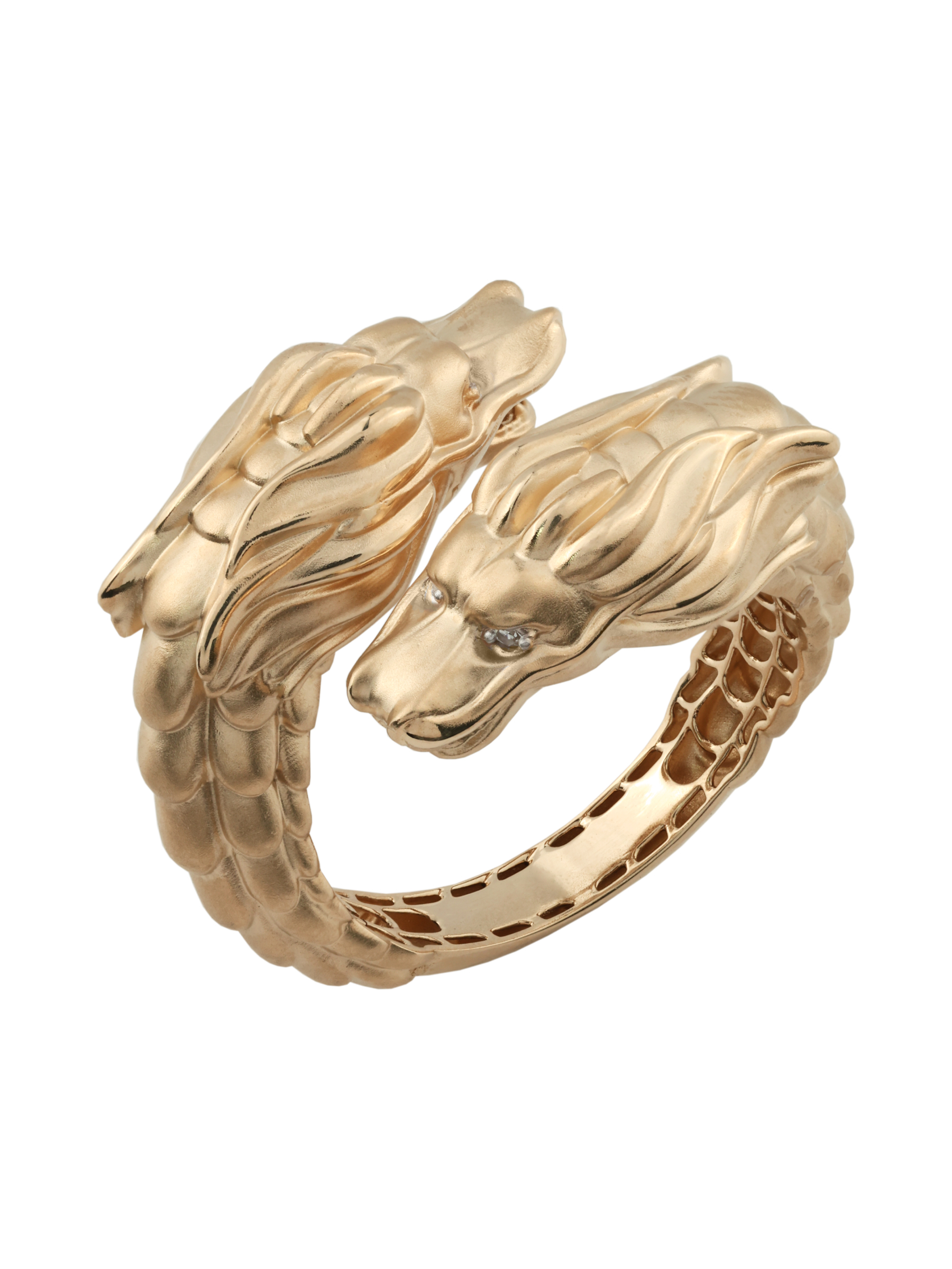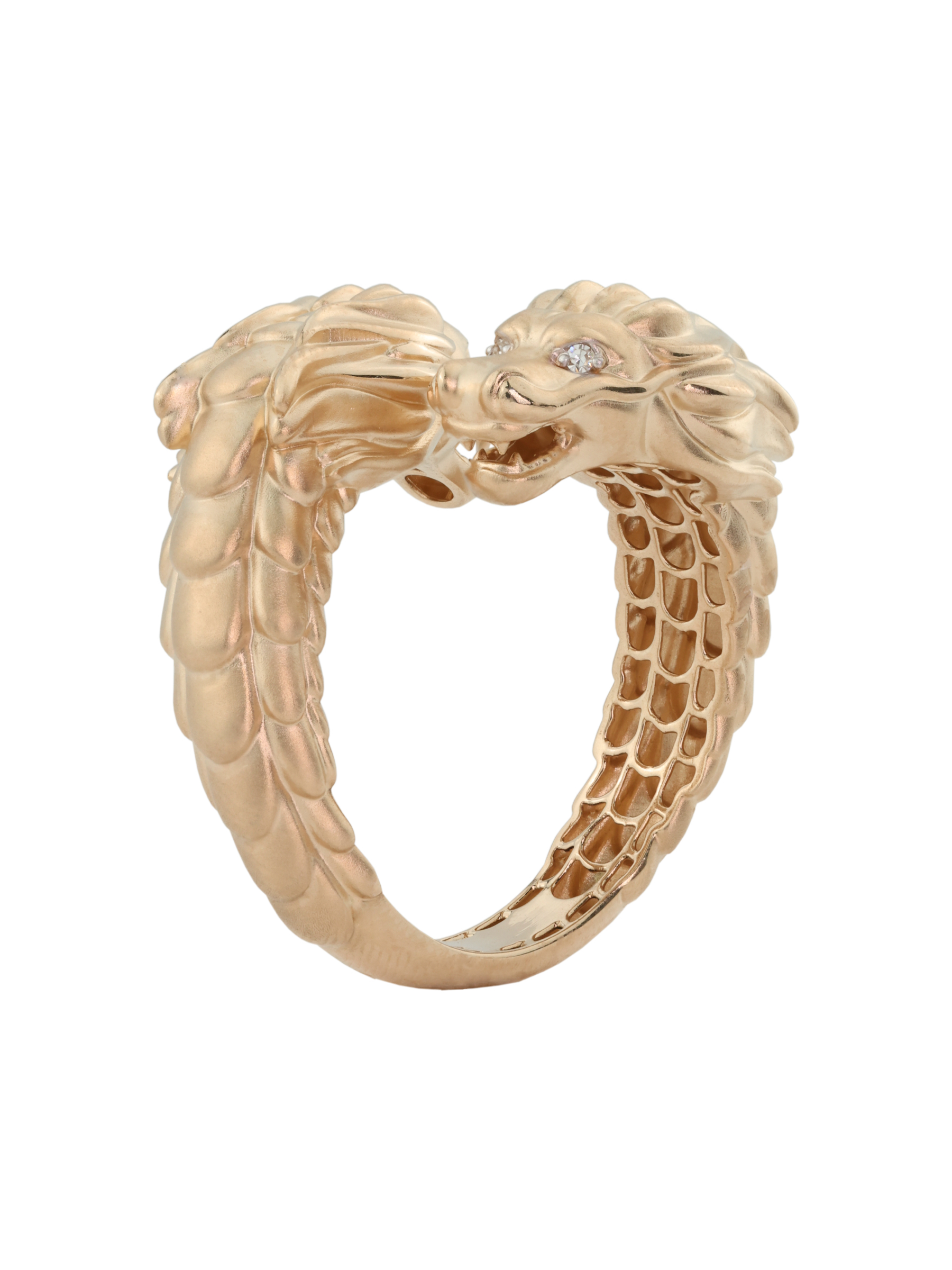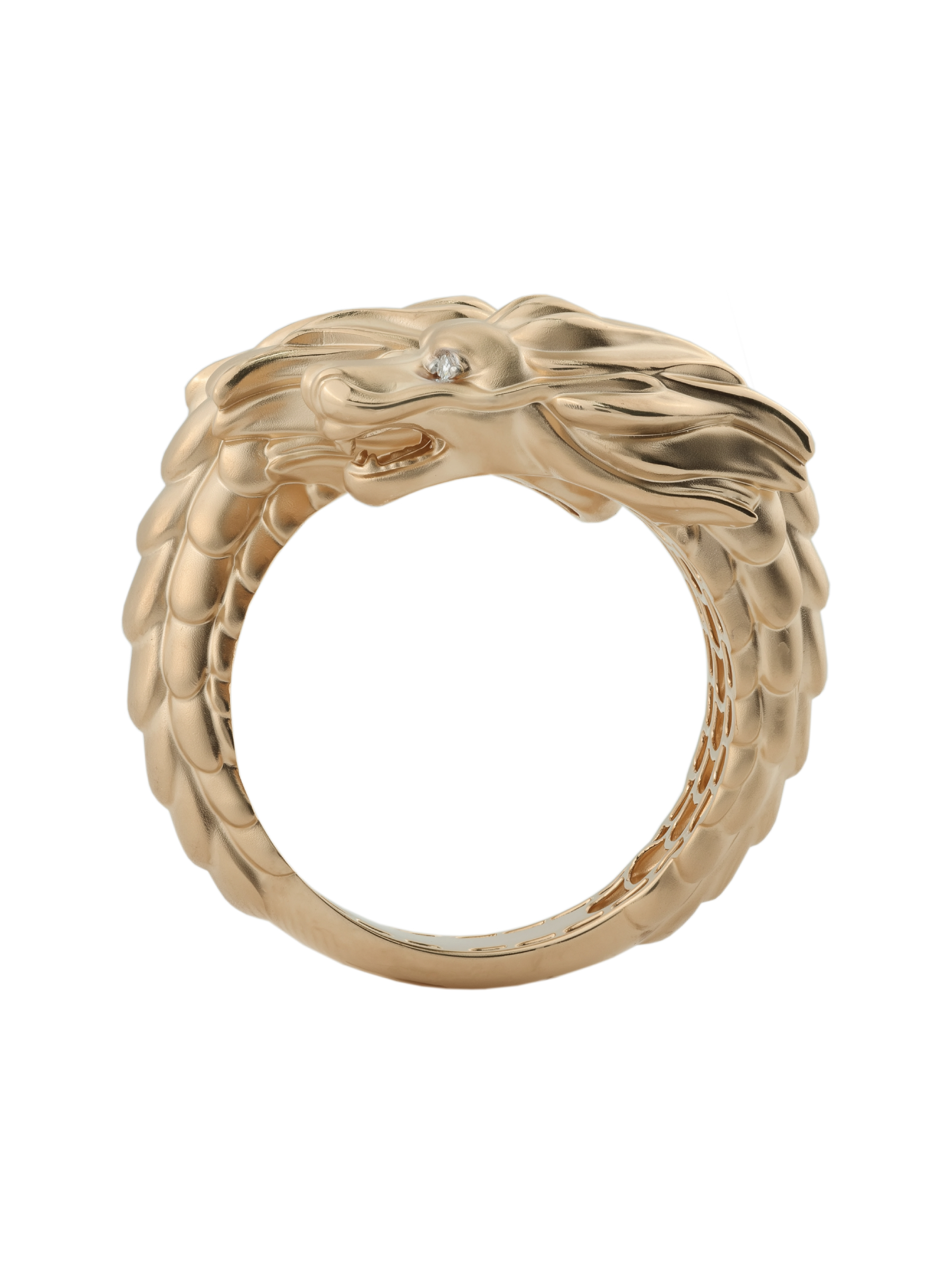 Ювелирное украшение инкрустировано 4 бриллиантами круглой огранки. Белый цвет вставок эффектно контрастирует с металлом, подчеркивая детализированную проработку чешуи и выразительный взгляд сказочного существа. Качественная обработка поверхности делает это кольцо не просто аксессуаром, а настоящим символом силы и стиля.