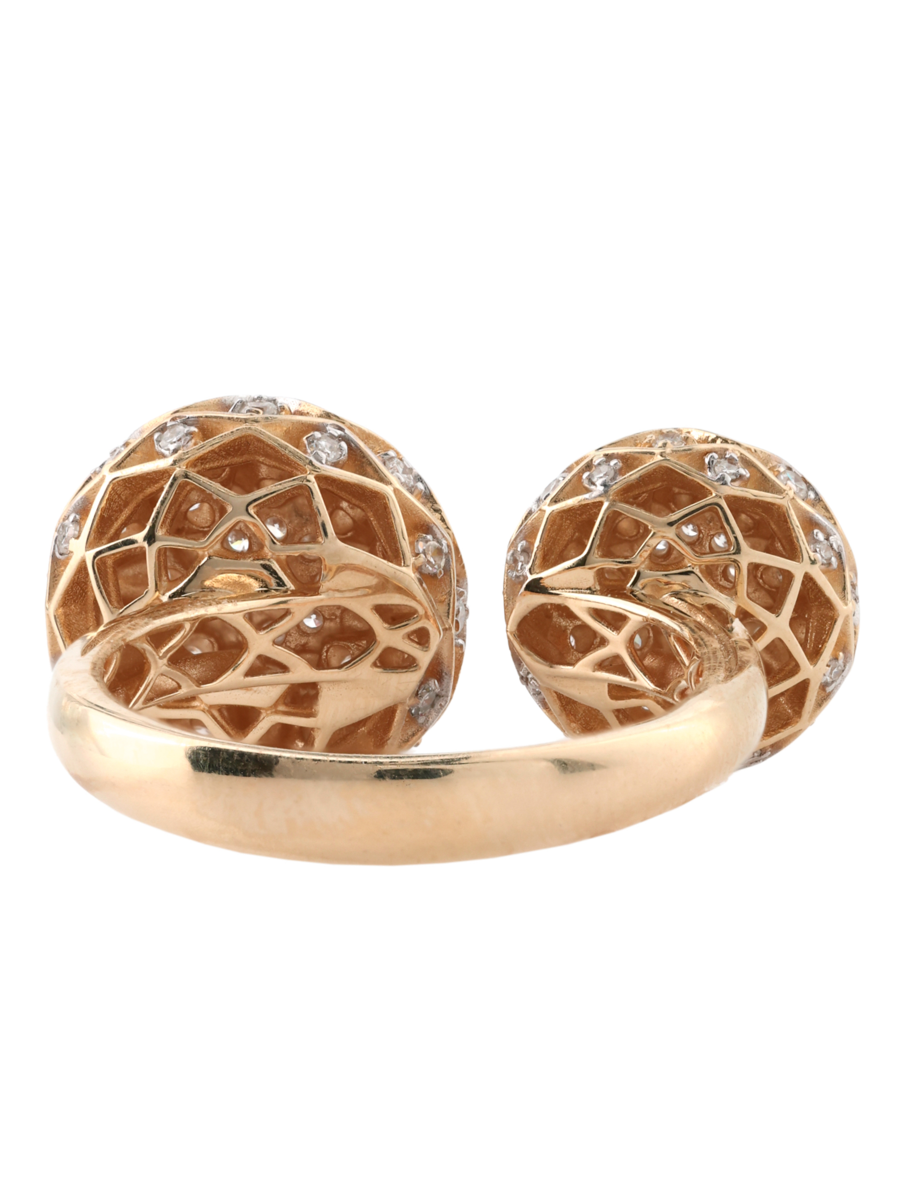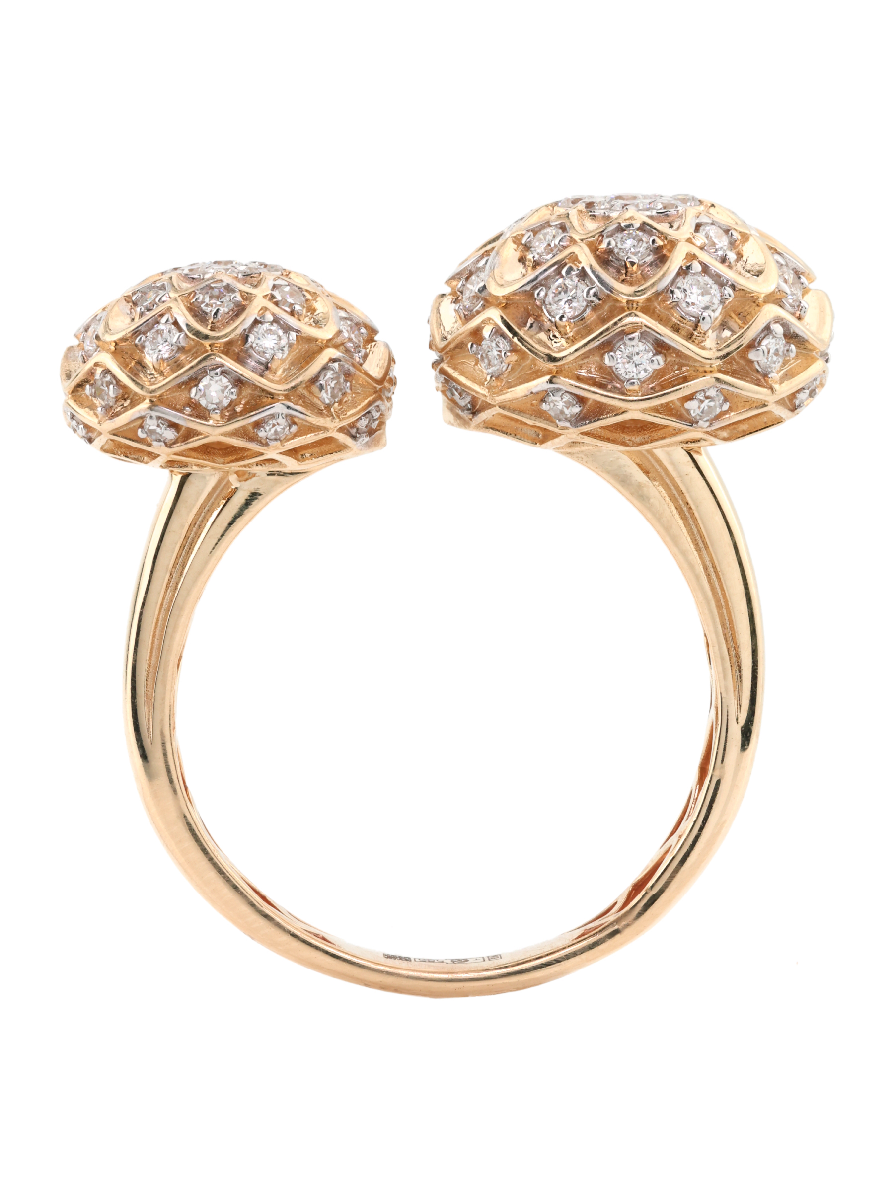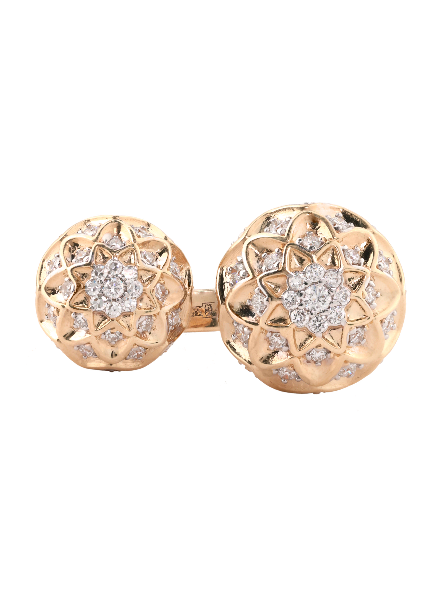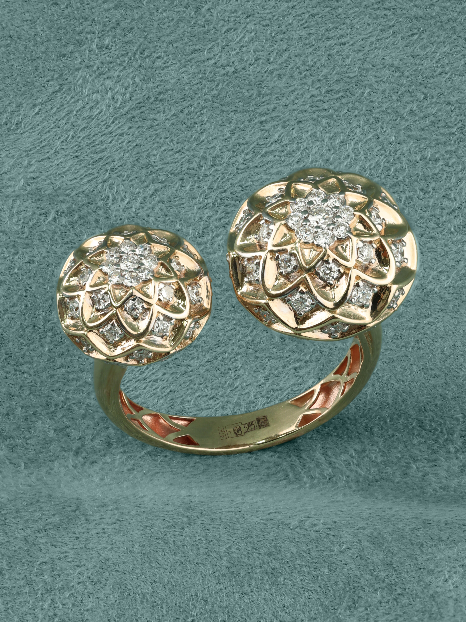 Кольцо из красного золота 585 пробы из коллекции Vioretty — Georginy станет изысканным акцентом вашего образа. Это ювелирное украшение выполнено в оригинальном дизайне: основу композиции составляют два крупных элемента в форме цветов, гармонично расположенных на разомкнутой шинке. Эффектный внешний вид изделия подчеркивается богатой инкрустацией — модель украшают 82 бриллианта круглой огранки с безупречным белым блеском.