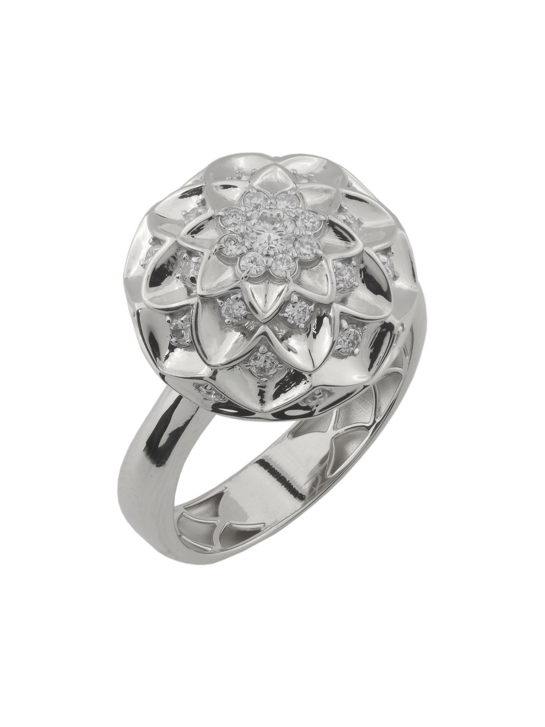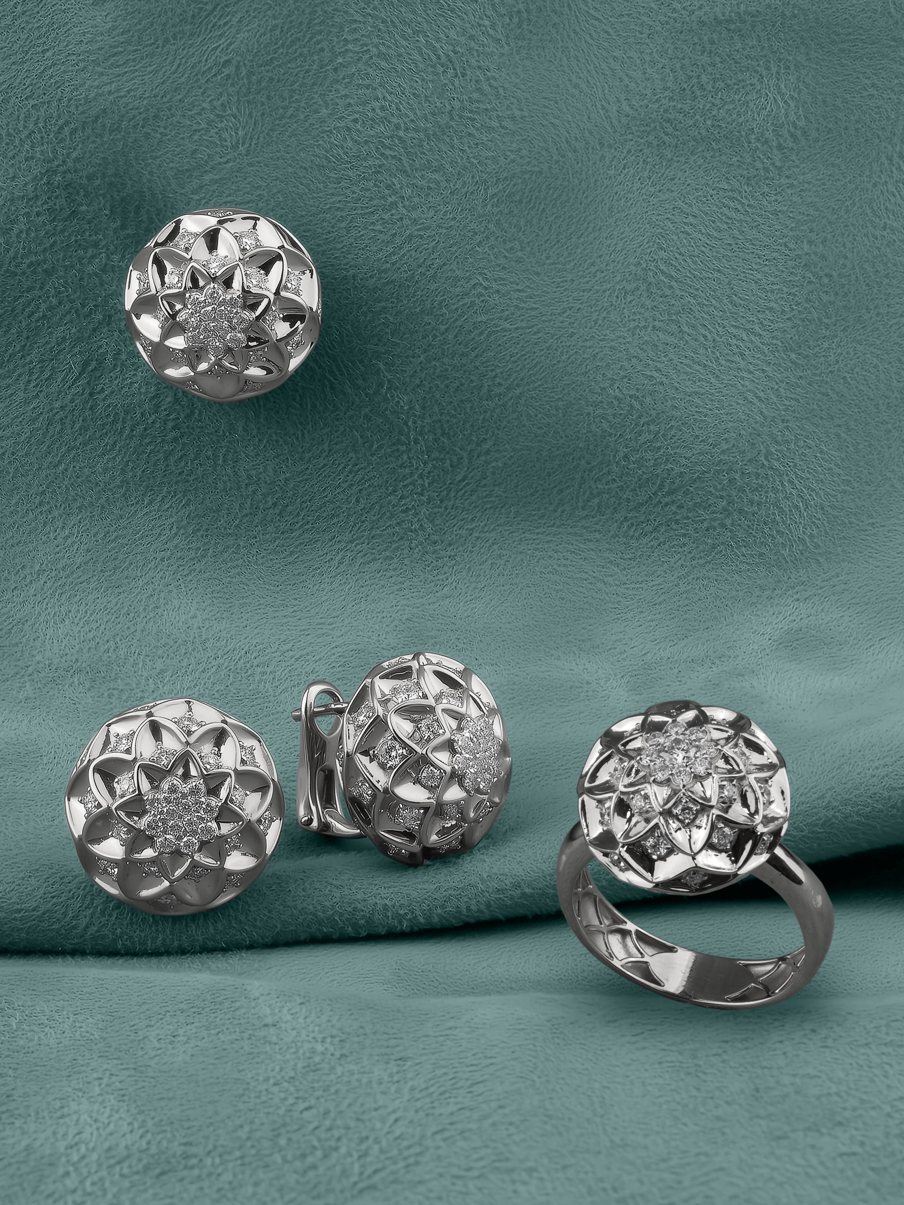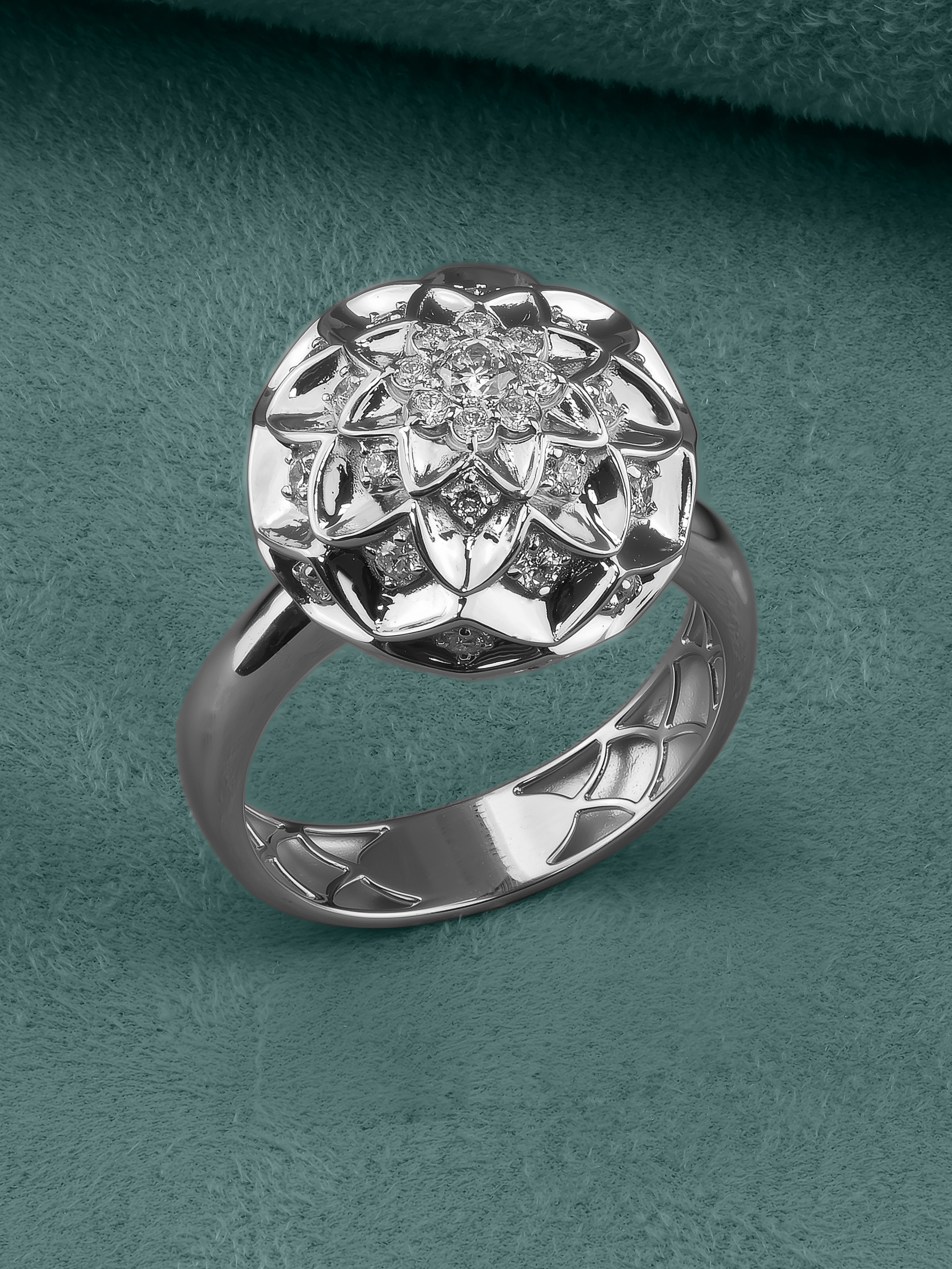 Холодный блеск белого золота подчеркивает чистоту камней, делая это изделие универсальным выбором как для женщин, так и для мужчин, которые ценят стиль и высокое качество. Такое кольцо с растительными мотивами гармонично впишется в вечерний образ или станет элегантным дополнением повседневного наряда. При необходимости изделие может быть частью гармоничного комплекта украшений.