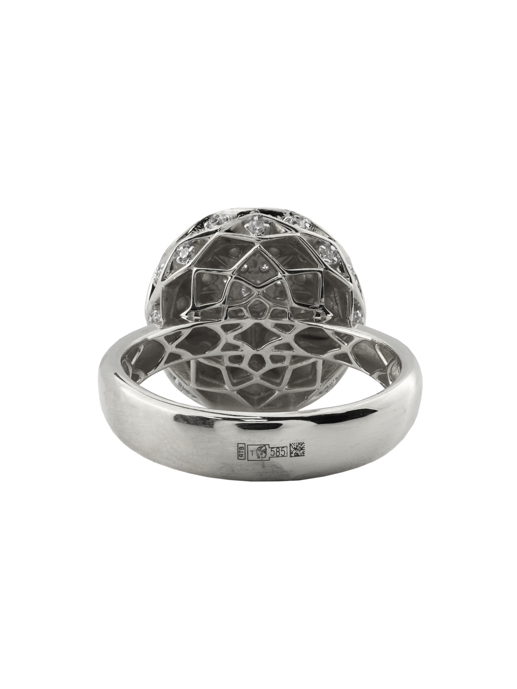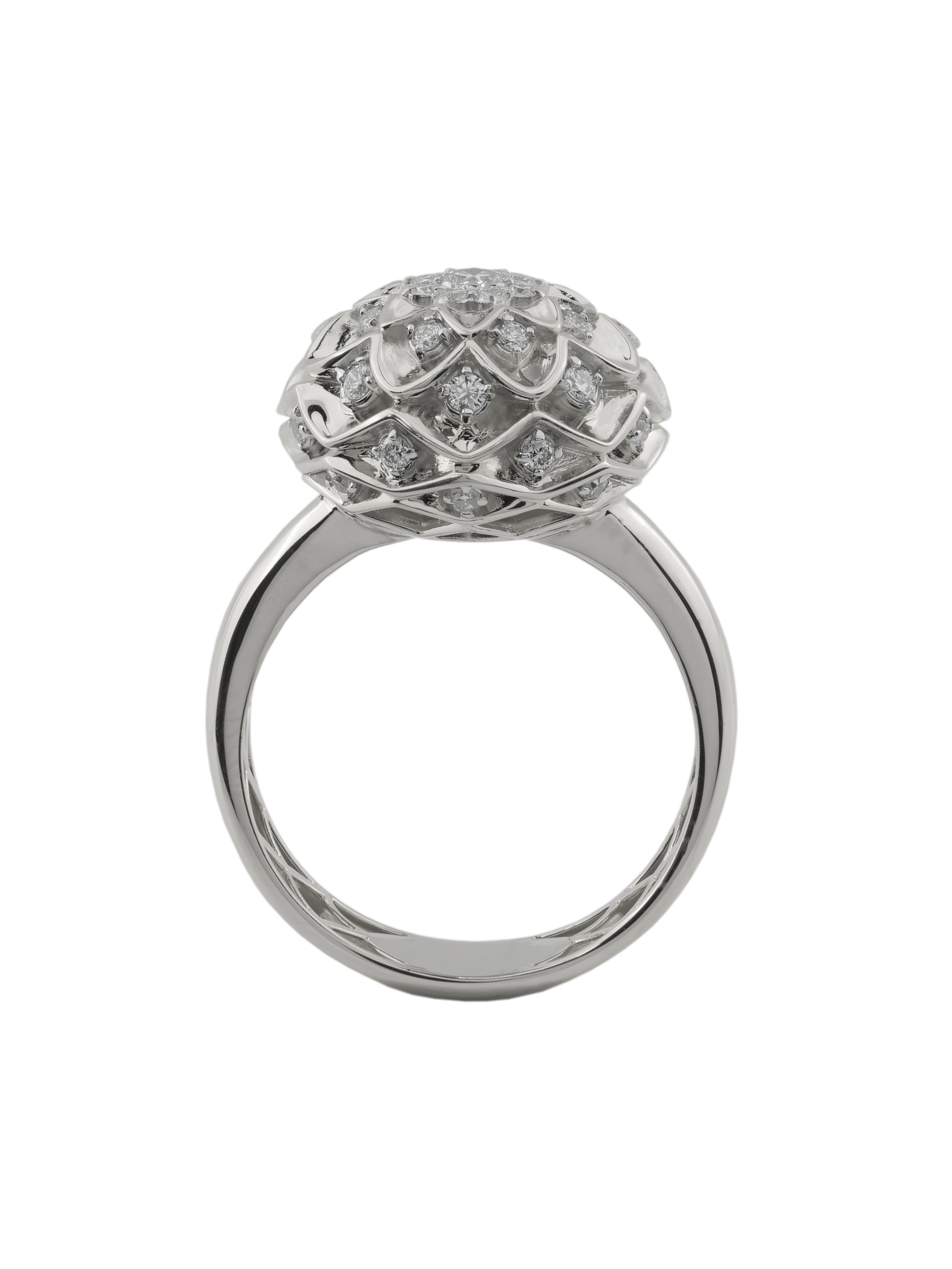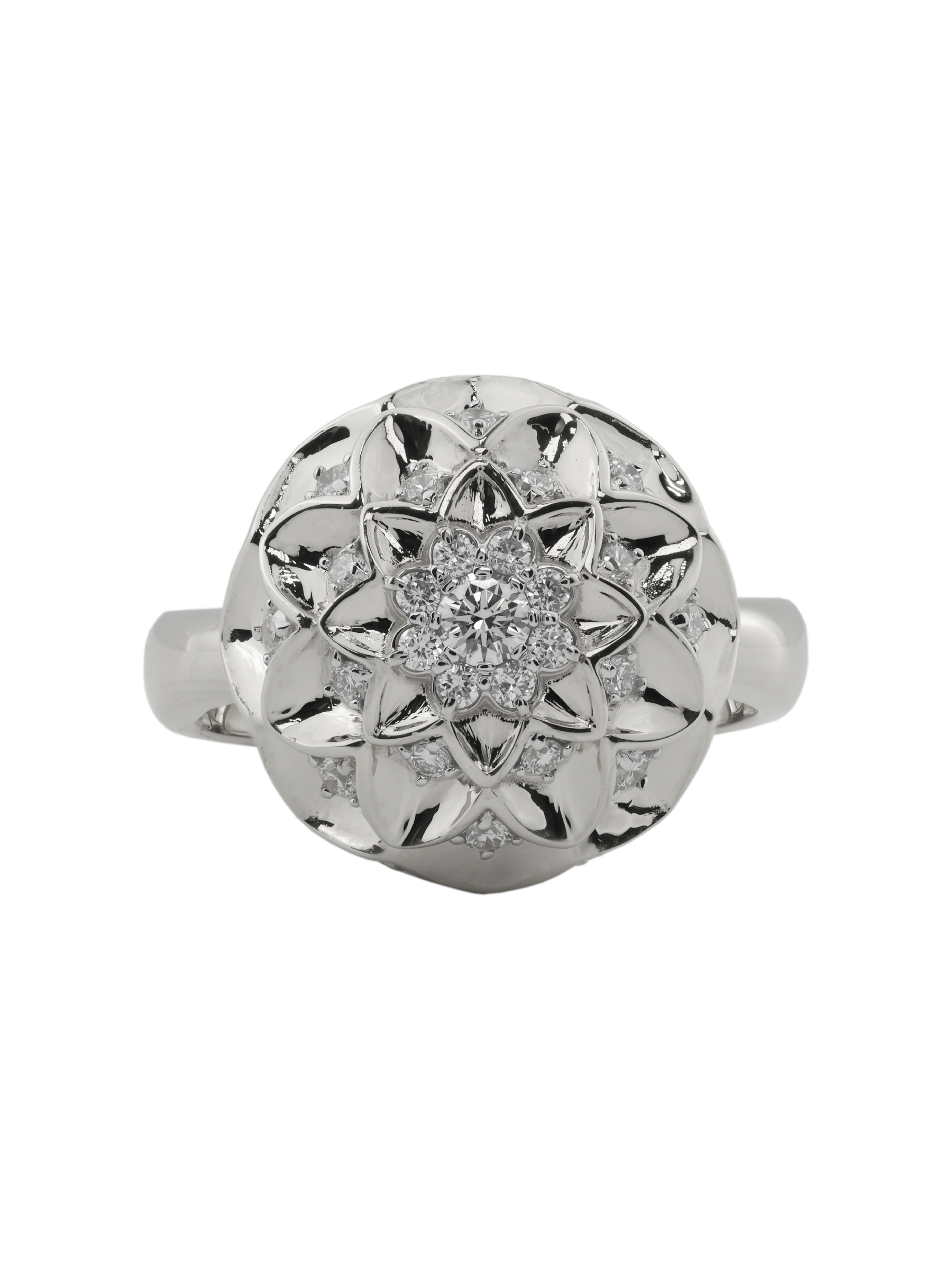 Холодный блеск белого золота подчеркивает чистоту камней, делая это изделие универсальным выбором как для женщин, так и для мужчин, которые ценят стиль и высокое качество. Такое кольцо с растительными мотивами гармонично впишется в вечерний образ или станет элегантным дополнением повседневного наряда. При необходимости изделие может быть частью гармоничного комплекта украшений.