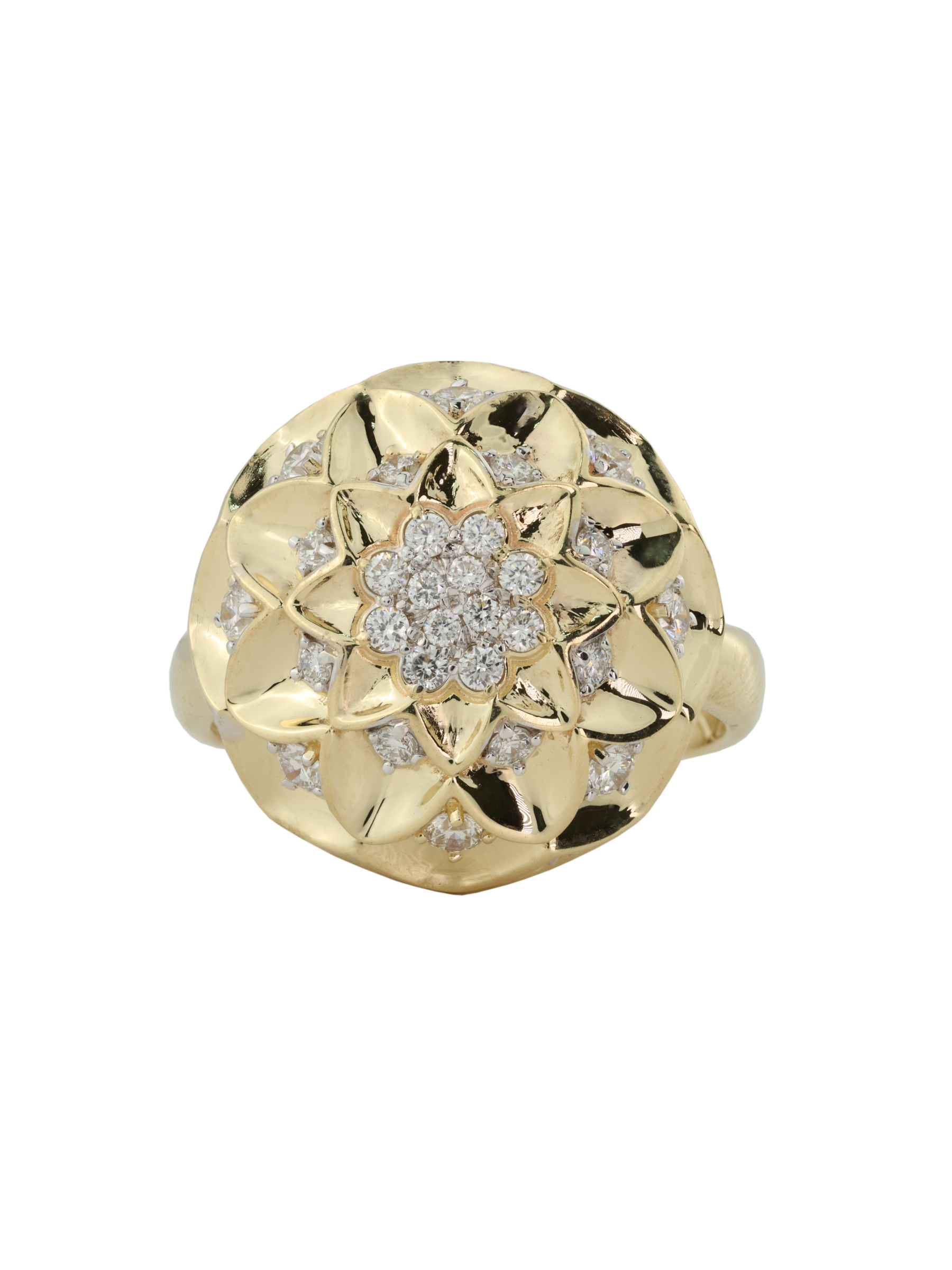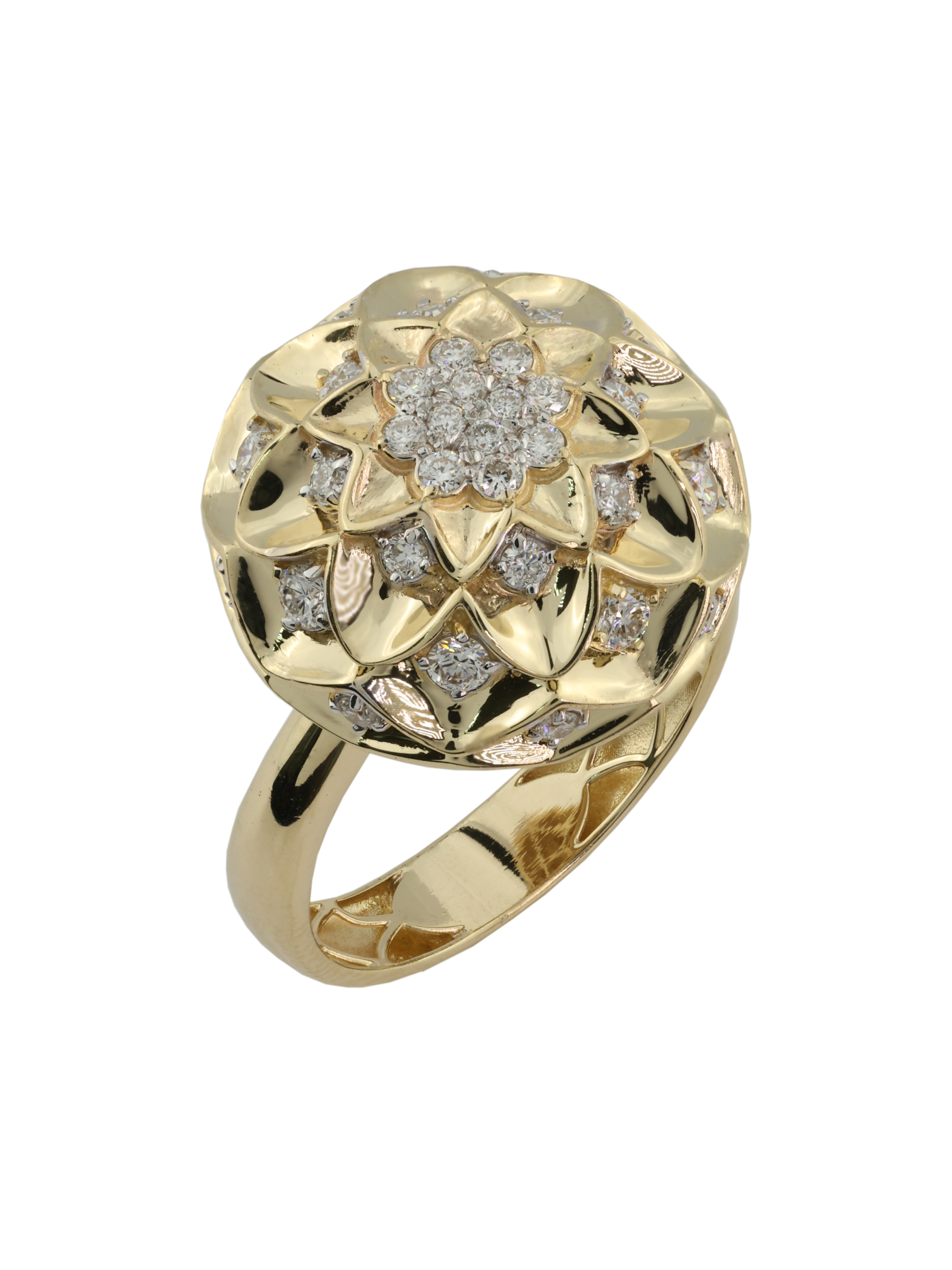 Кольцо из лимонного золота 585 пробы — это изысканное ювелирное украшение, воплощающее утонченную эстетику коллекции Vioretty — Georginy. Дизайн изделия, выполненный в флористическом стиле, напоминает распускающийся цветок, где каждый лепесток подчеркивает благородный оттенок металла. В центре композиции и по ее периметру гармонично расположились 44 бриллианта круглой формы с чистым белым цветом вставок, создавая ослепительную игру света.