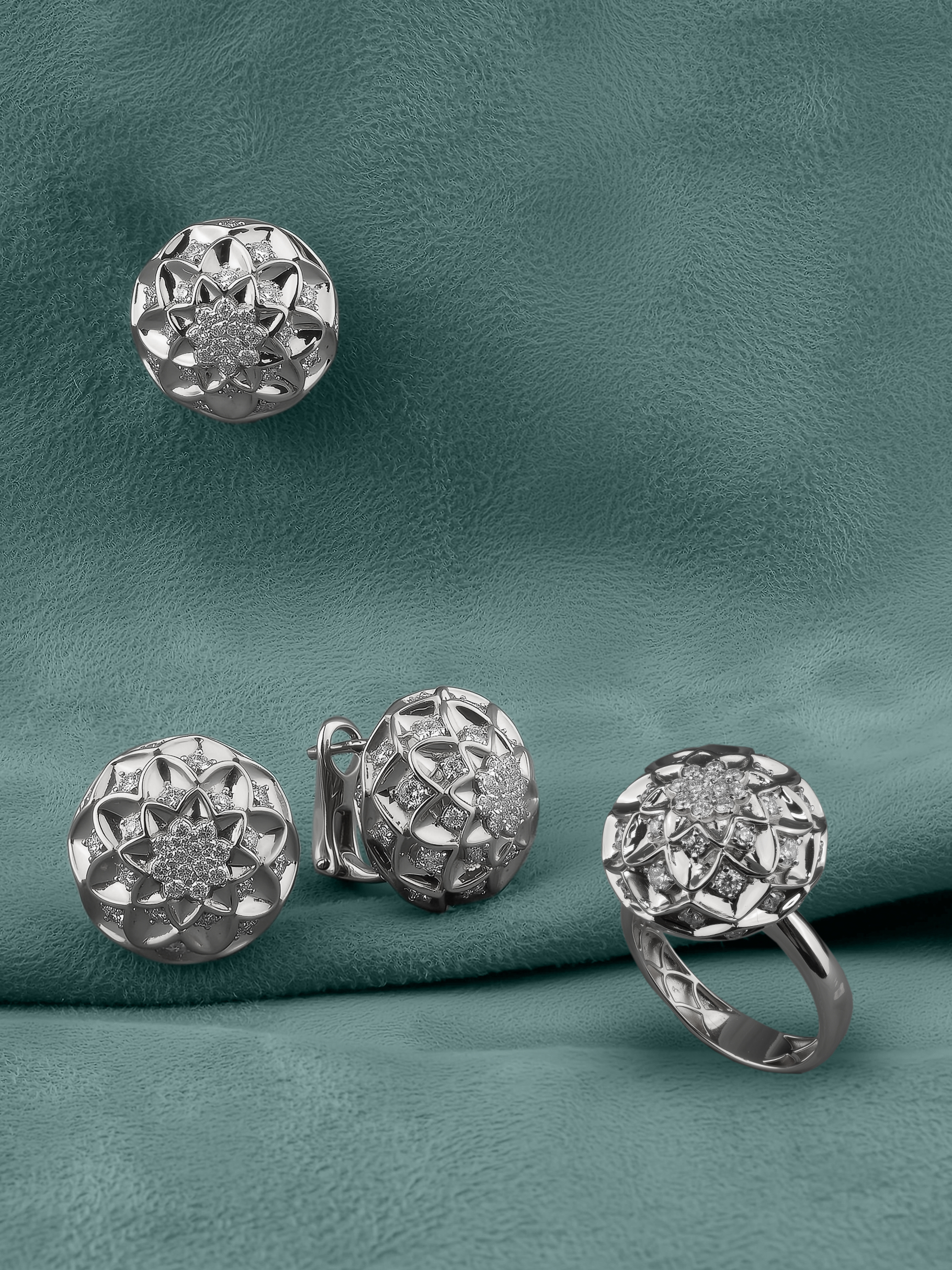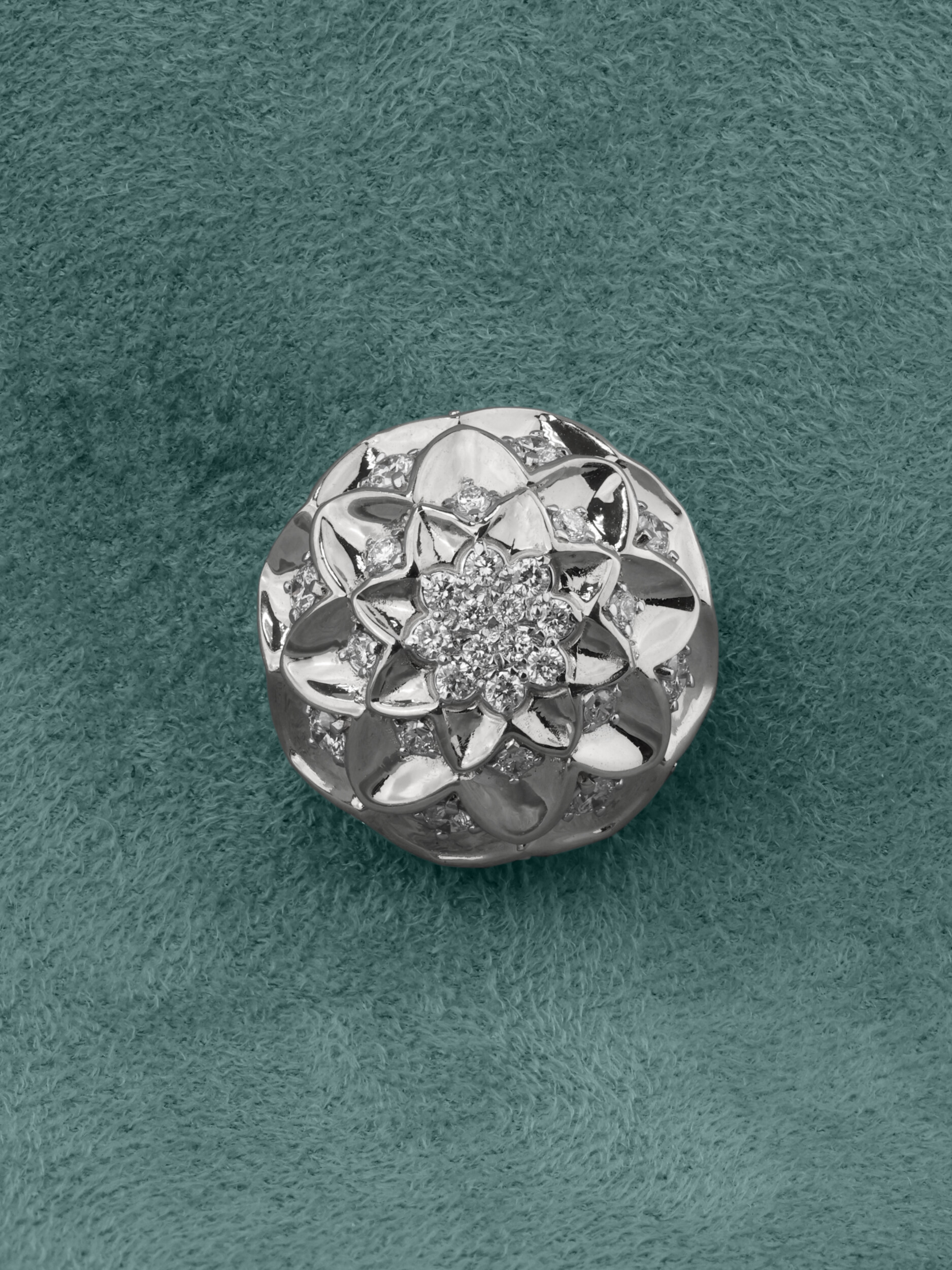 Центральная часть и лепестки украшены 42 круглыми бриллиантами с белым цветом вставок. Качественная огранка позволяет камням максимально отражать свет, создавая притягательную игру бликов. Такая подвеска универсальна и подойдет как для женщин, так и для мужчин, предпочитающих премиальные аксессуары с лаконичным, но запоминающимся дизайном. Изящная форма цветка делает изделие прекрасным дополнением к вечернему наряду или акцентным элементом повседневного образа.