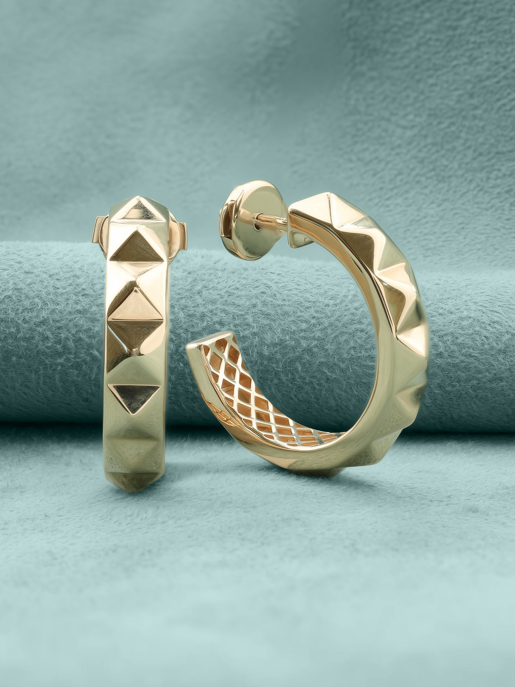 Элегантные и выразительные серьги из красного золота 585 пробы станут акцентным дополнением вашего образа. Это стильное ювелирное украшение из коллекции Vioretty — Piramidi выполнено в современном дизайне, который объединяет лаконичность форм и геометрию граней. Фактурная поверхность изделия напоминает аккуратные пирамиды, что придает украшению динамику и особый блеск при попадании света.