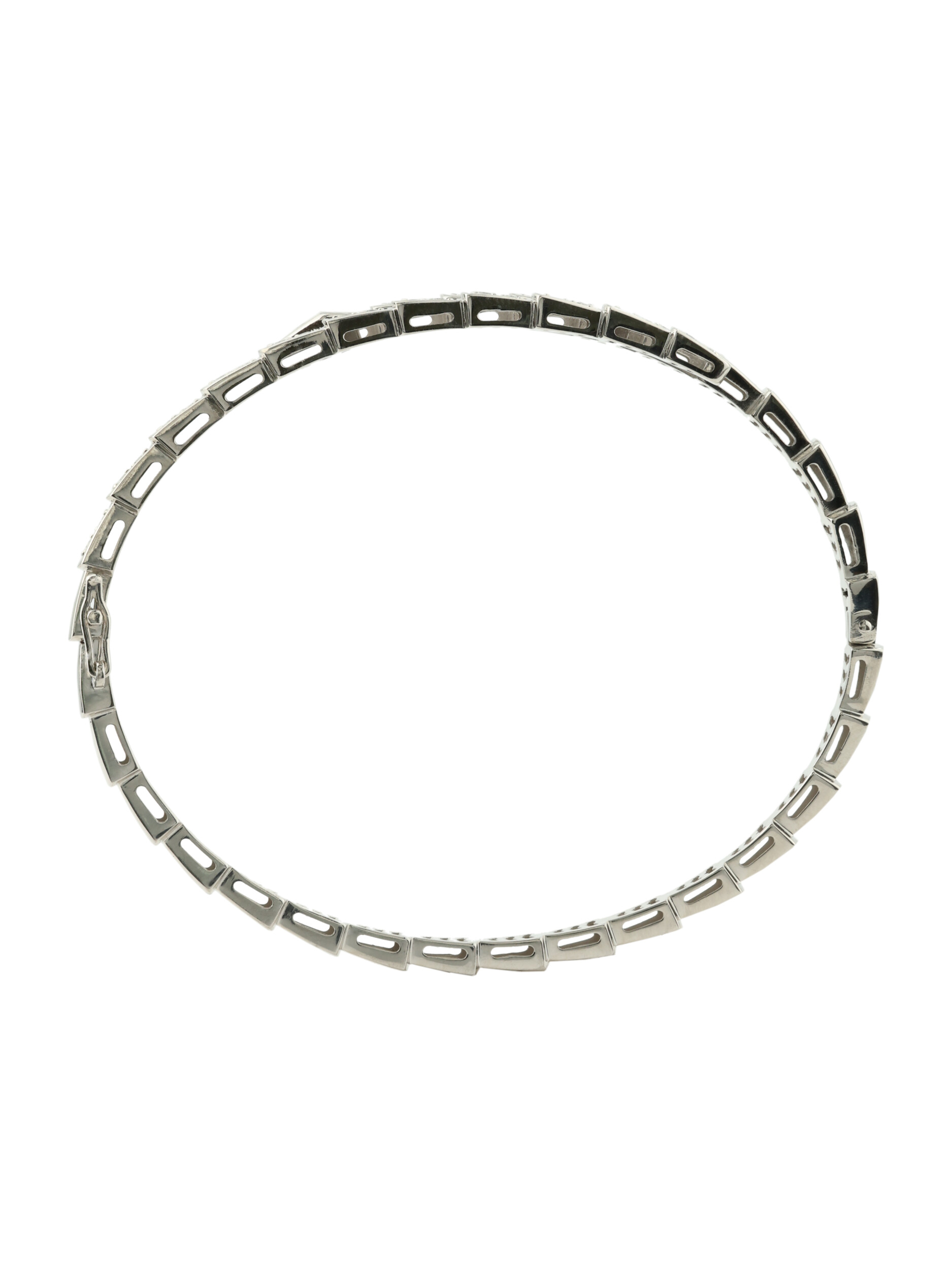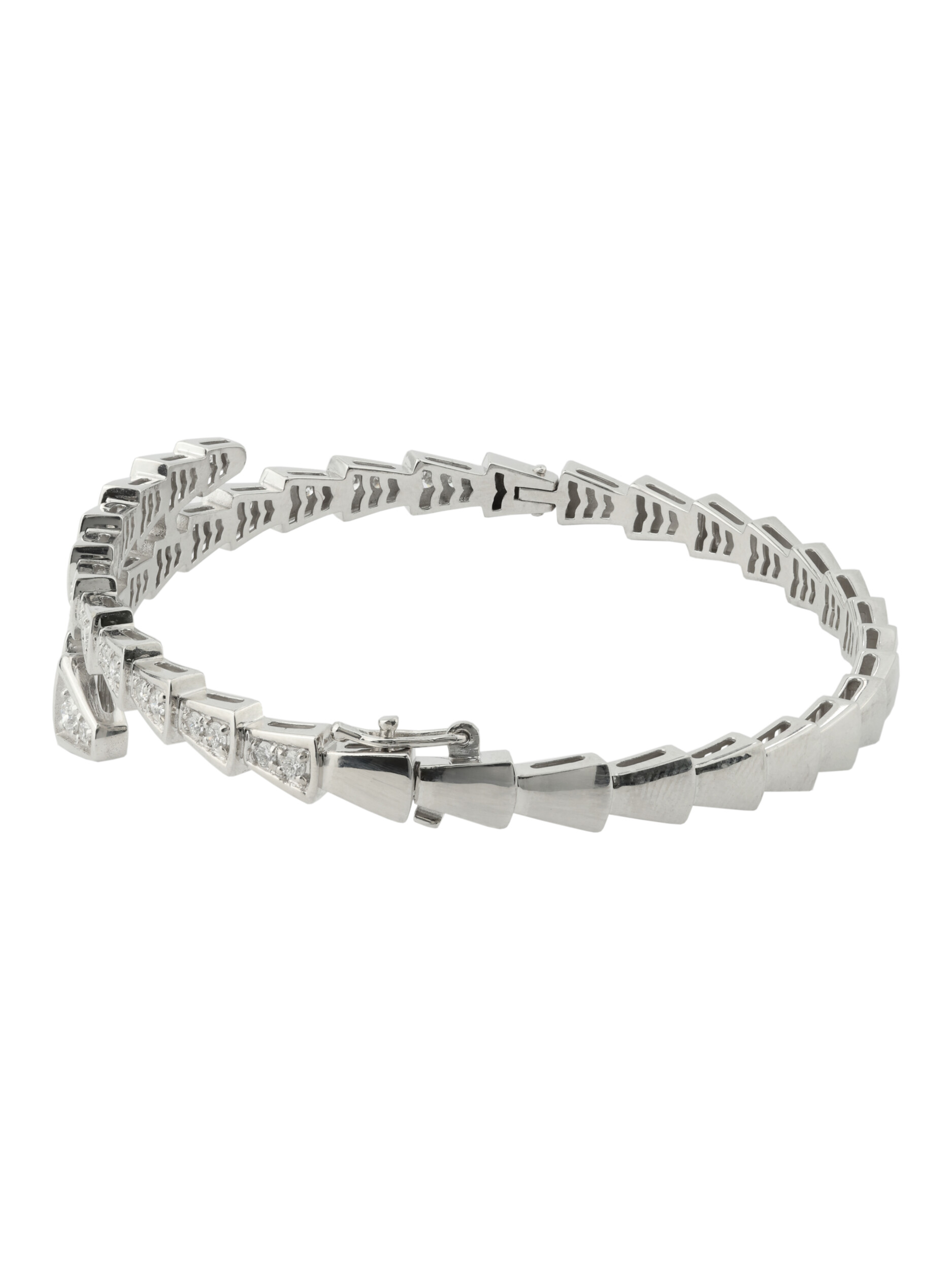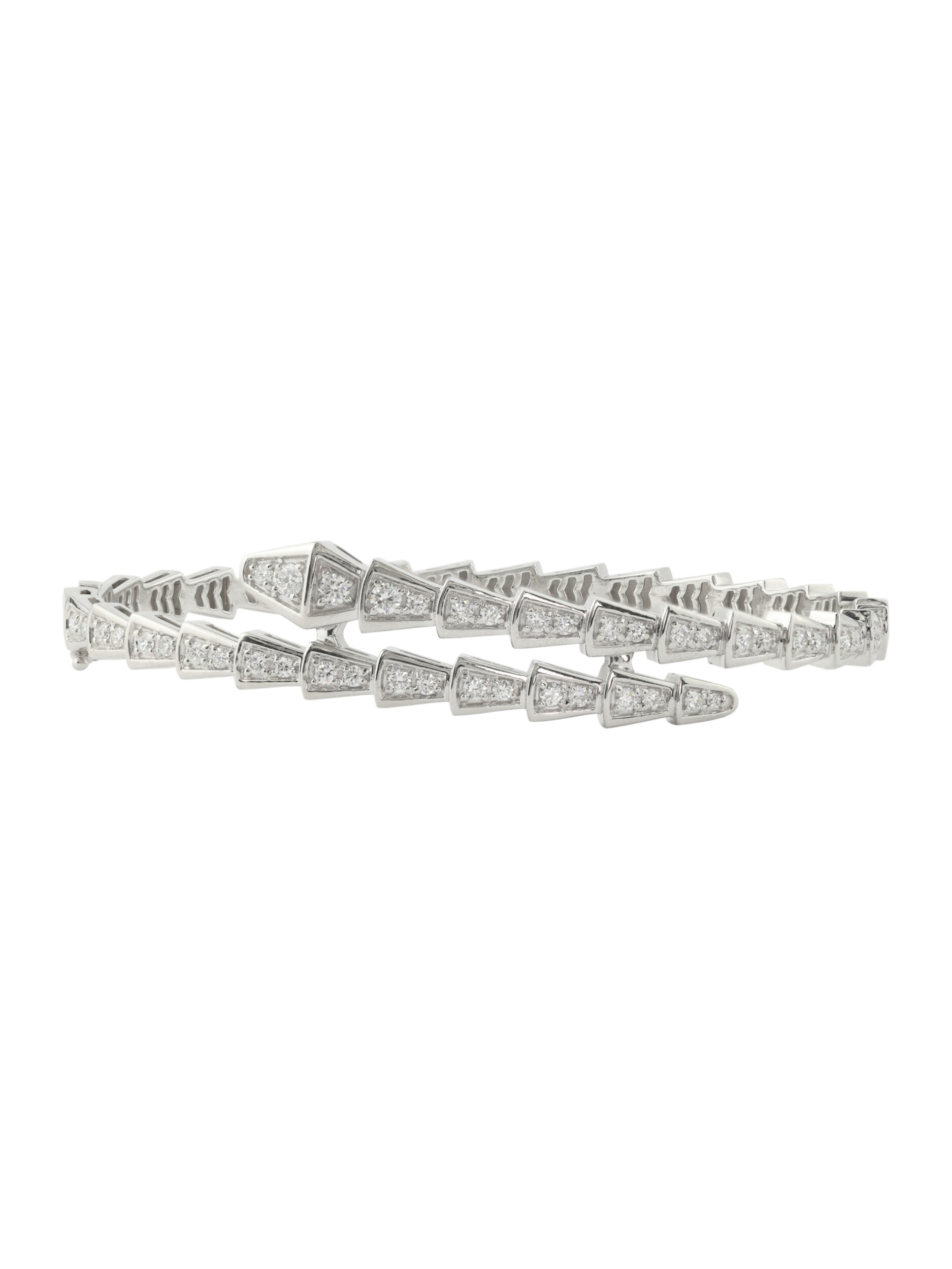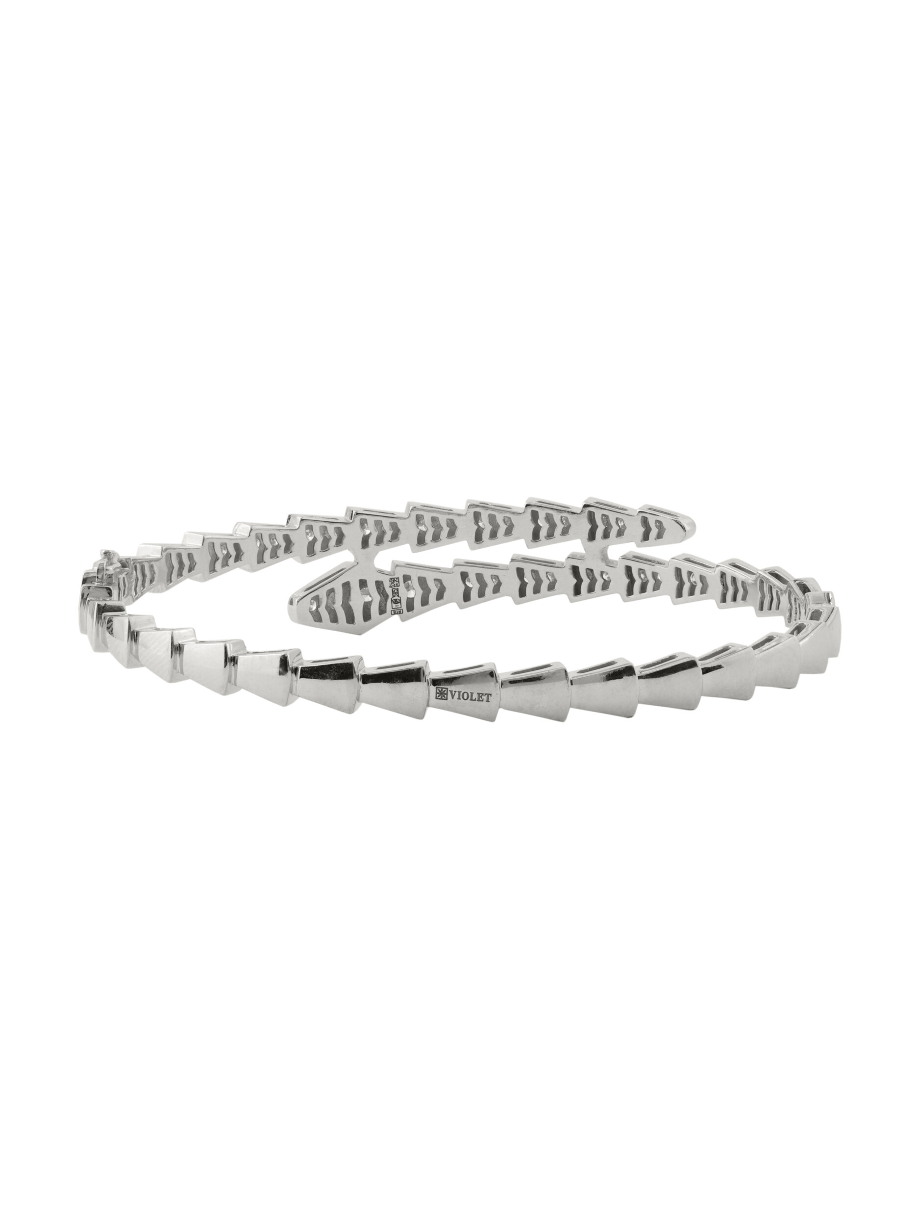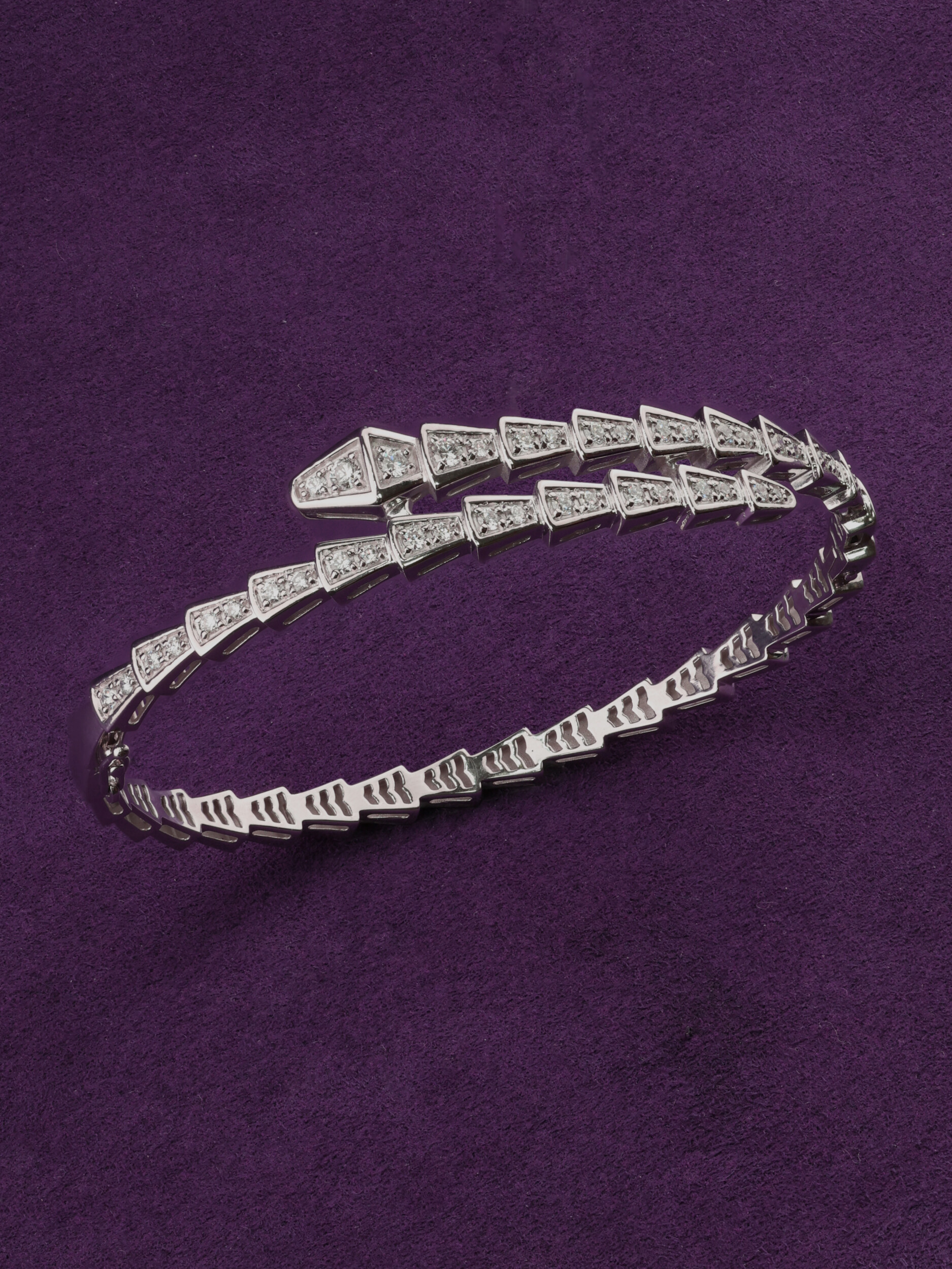 Эффектный и дерзкий браслет из коллекции De Luxe — Серпенти воплощает в себе грацию и скрытую силу. Это ювелирное украшение выполнено в виде извивающегося скорпиона, чей узнаваемый дизайн притягивает взгляды и подчеркивает статус владельца. Изделие изготовлено из качественного белого золота 585 пробы, что обеспечивает прочность конструкции и благородный холодный блеск.