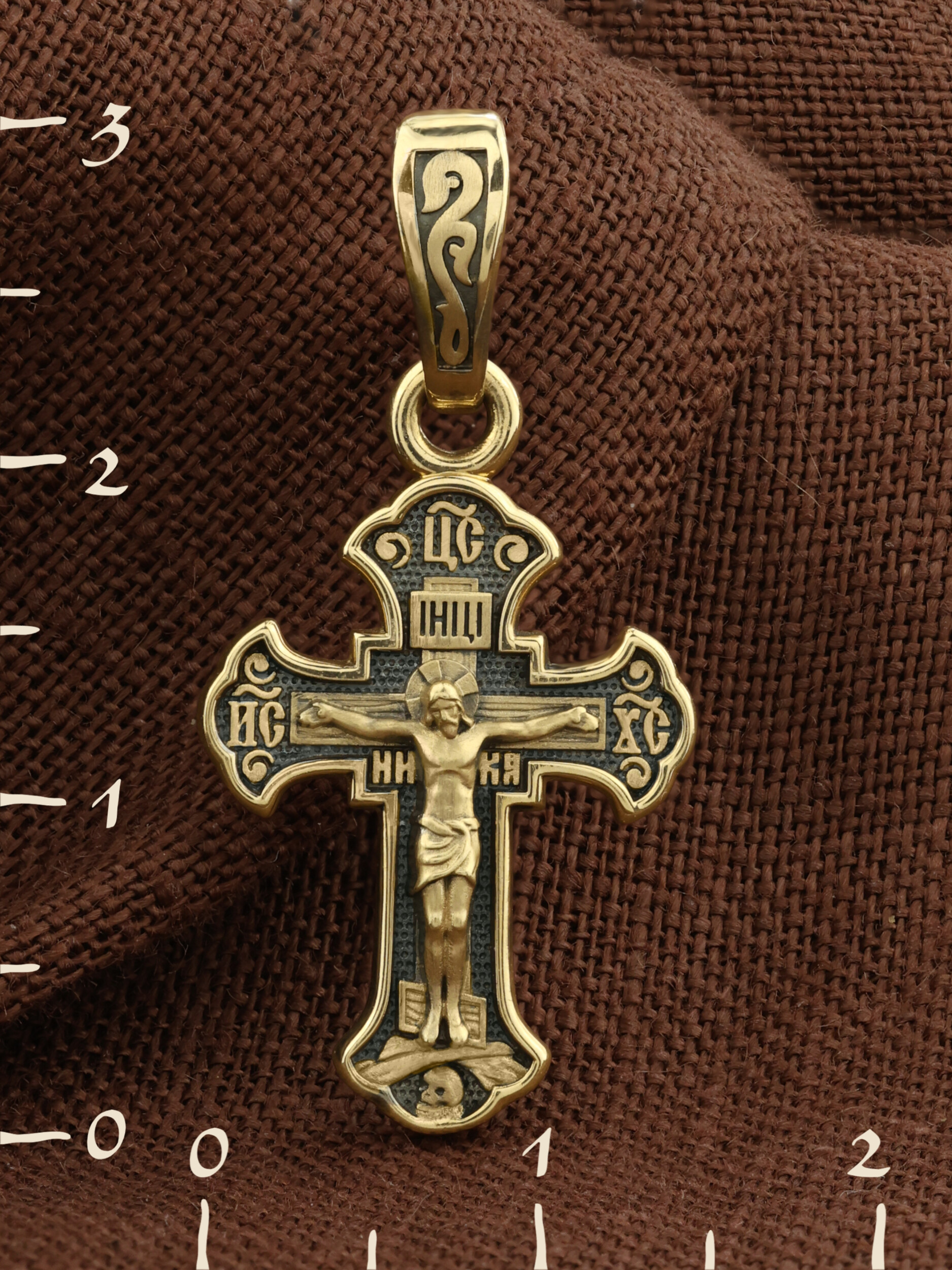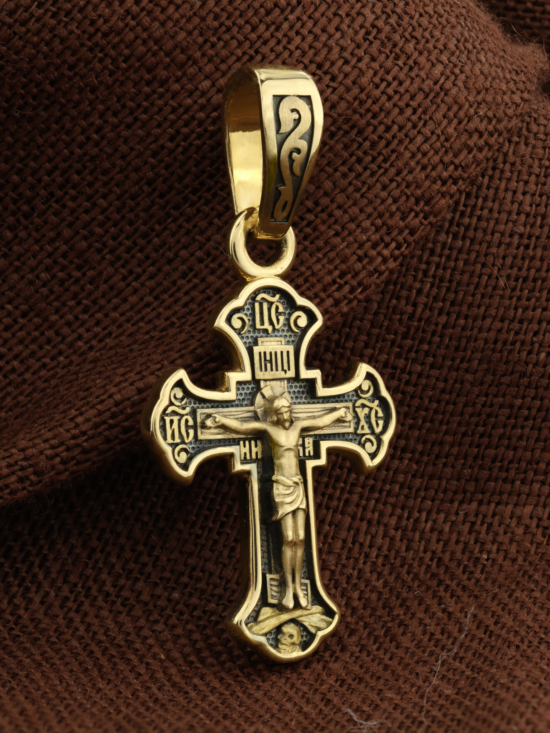 На лицевой стороне креста изображено Распятие Господа и Спасителя нашего Иисуса Христа, отдавшего Себя на смерть для искупления грехов мира. Крест является символом жертвенной любви Всеблагого Бога к падшим людям, всепобеждающим духовным оружием христиан, основанием и средоточием церковной жизни. Над вершиной Распятия помещена надпись «Царь Славы». На верхней перекладине расположена надпись «IНЦI». Она символизирует титло — табличку, на которой, согласно Евангелию, было начертано: Иисус Назорей, Царь Иудейский. Надпись «IC» «ХC»», означает Иисус Христос, помещаются на разных сторонах поперечной перекладины креста. Ниже помещена надпись «НИКА», что означает «победитель». Крест стоит на горе камней, символизирующих Голгофу. Под подножием Креста изображена покоящаяся голова (череп) Адама.